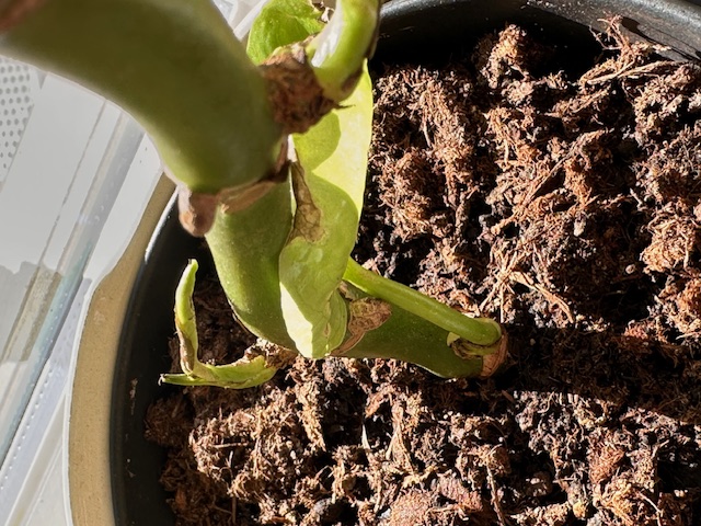 Die Pflanze hat im vergangenen Herbst begonnen, braune Blätter zu entwickeln. Daraufhin habe ich sie zurückgeschnitten und in diesem Frühjahr umgetopft. Dabei habe ich die Wurzeln gründlich abgespült und frische Erde verwendet. Nun treibt sie zwar wieder aus, doch leider zeigen alle neuen Blätter erneut dunkle Spitzen (s. Foto).