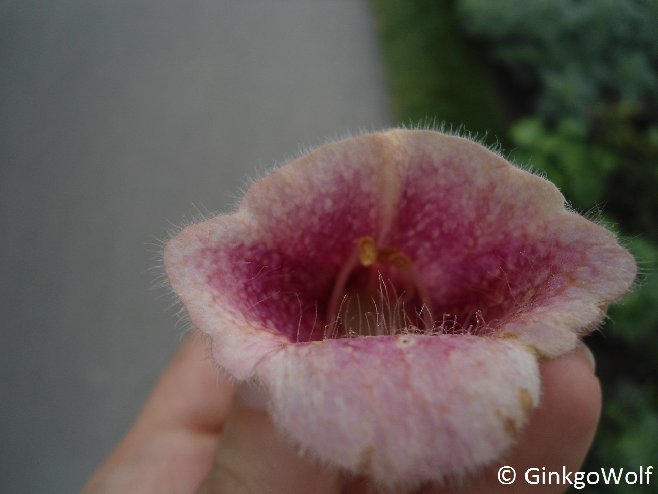 - Blüte der Stammform rötlich-rosa mit weißlich-rosa Schlundflecken