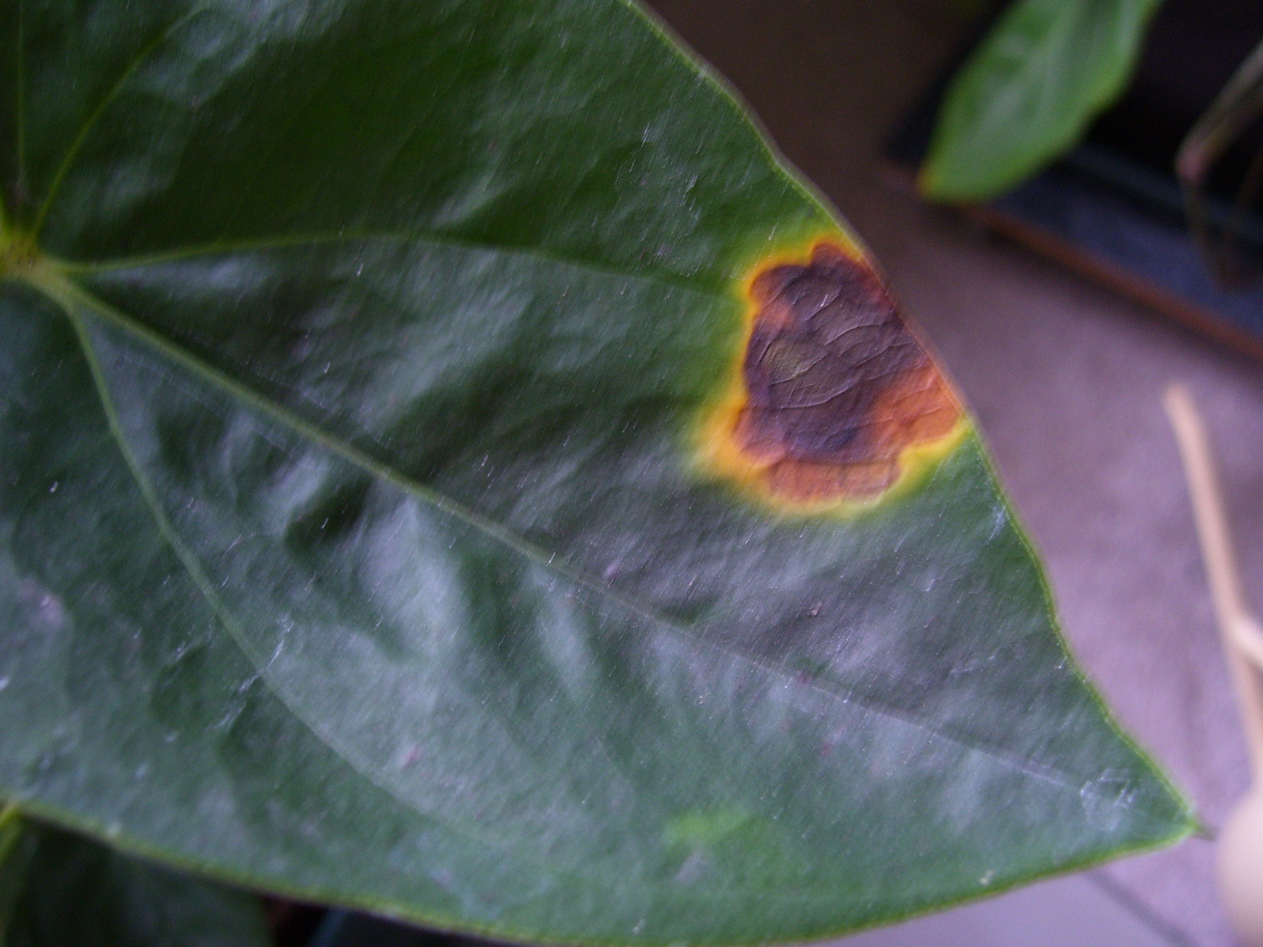 Ich habe zwei Flamingoblumen,eine mit roten Blüten und eine mit grünweißen Blüten,und an beiden habe ich Flecke auf den Blättern