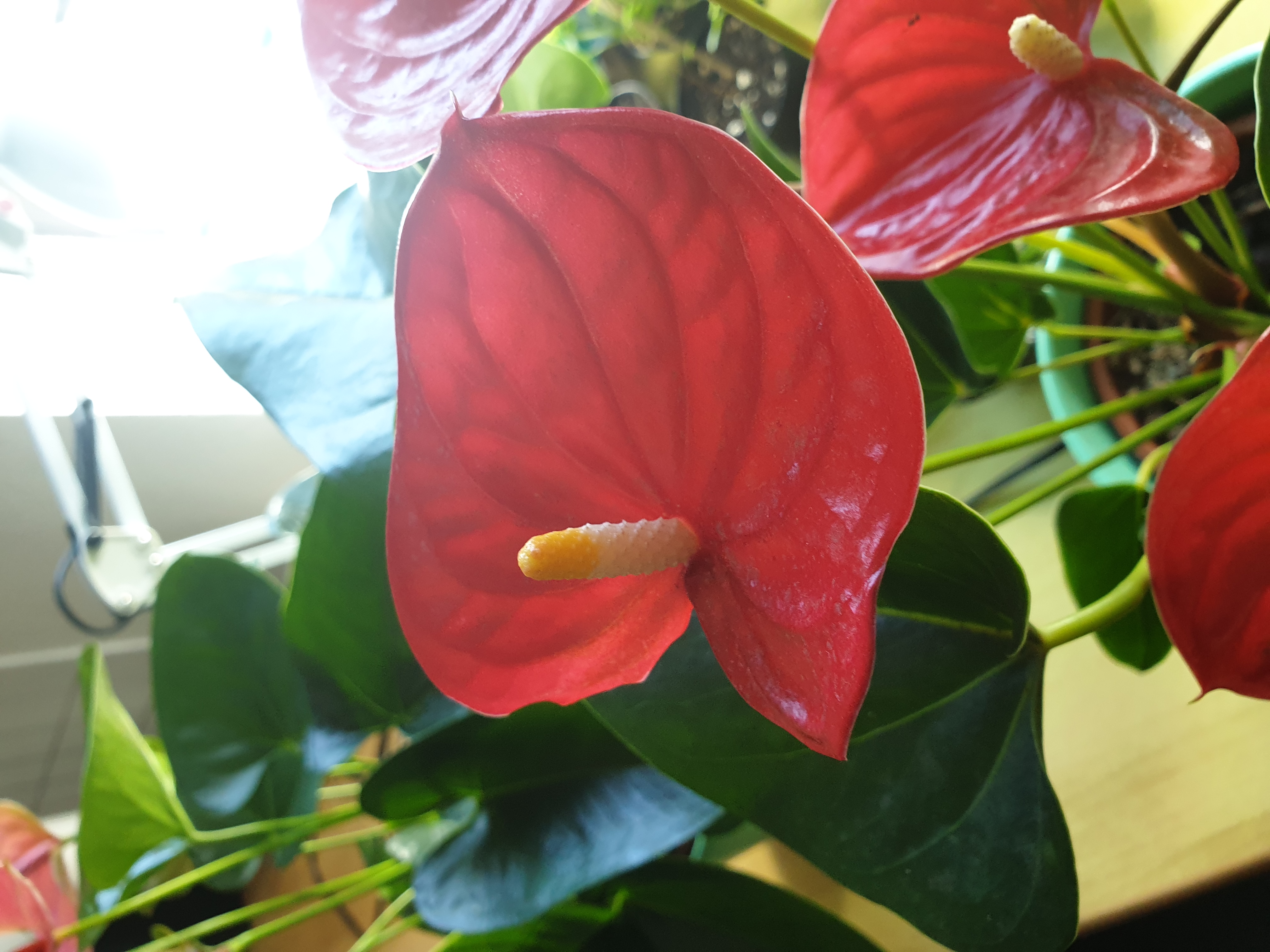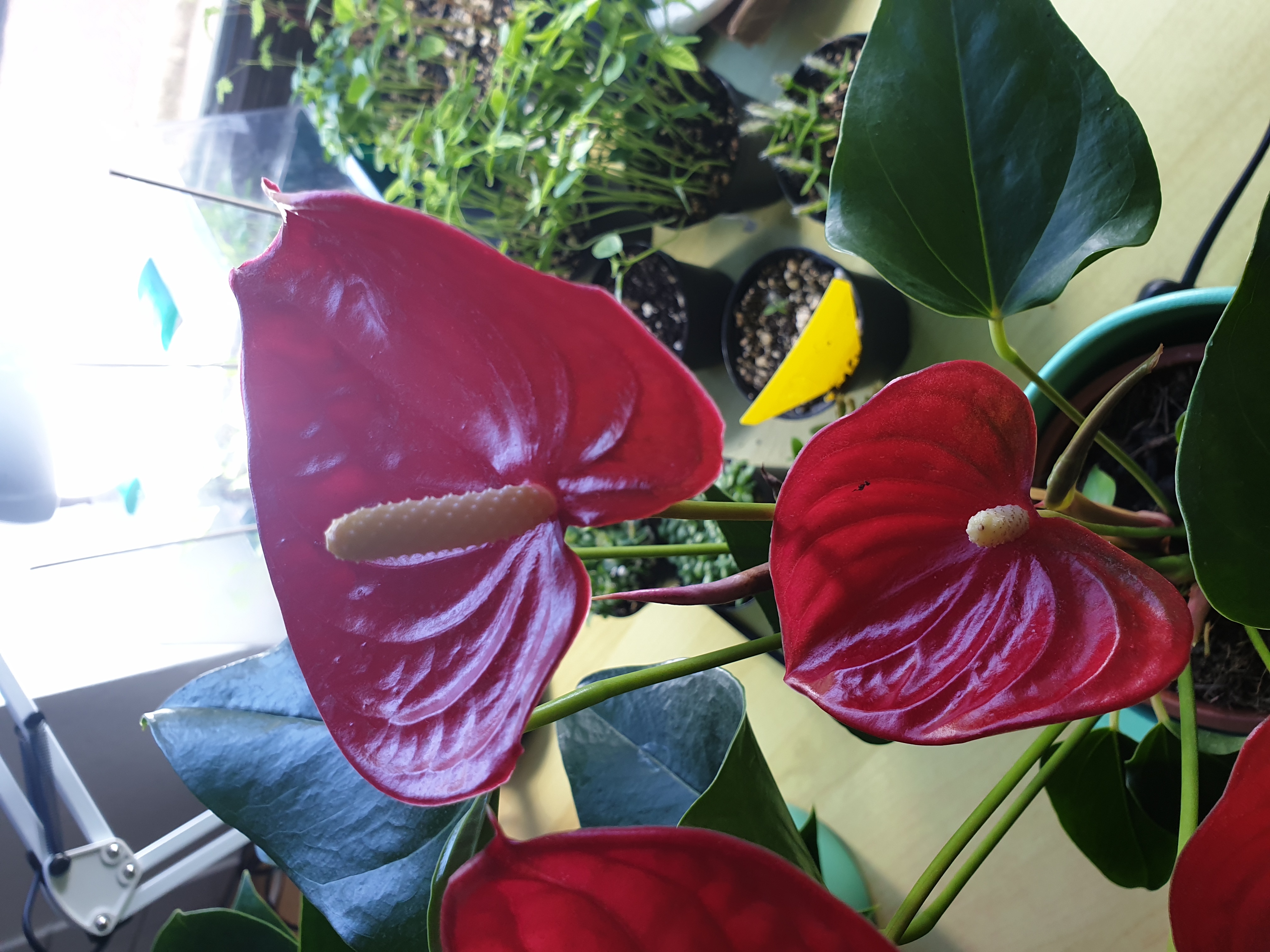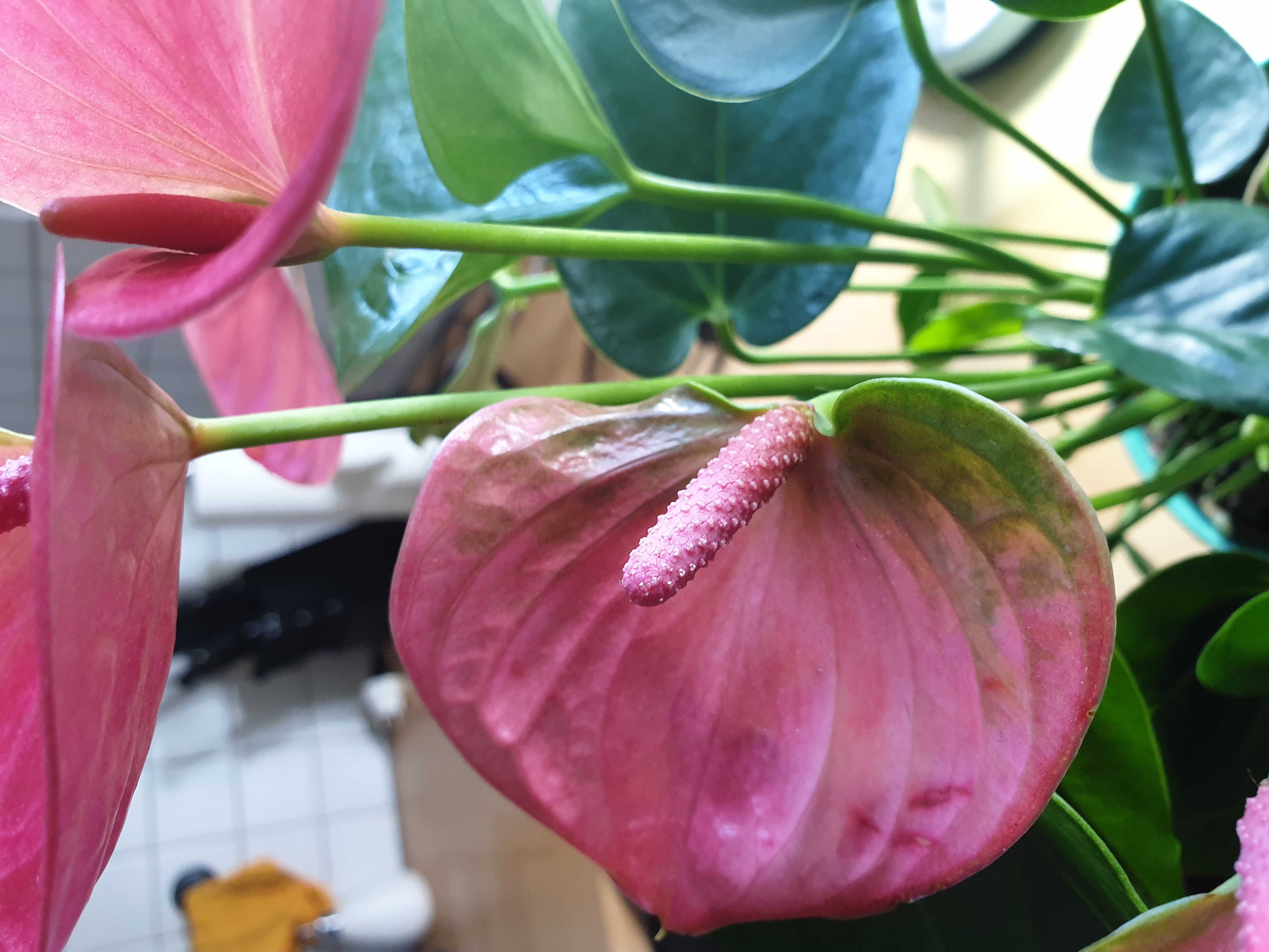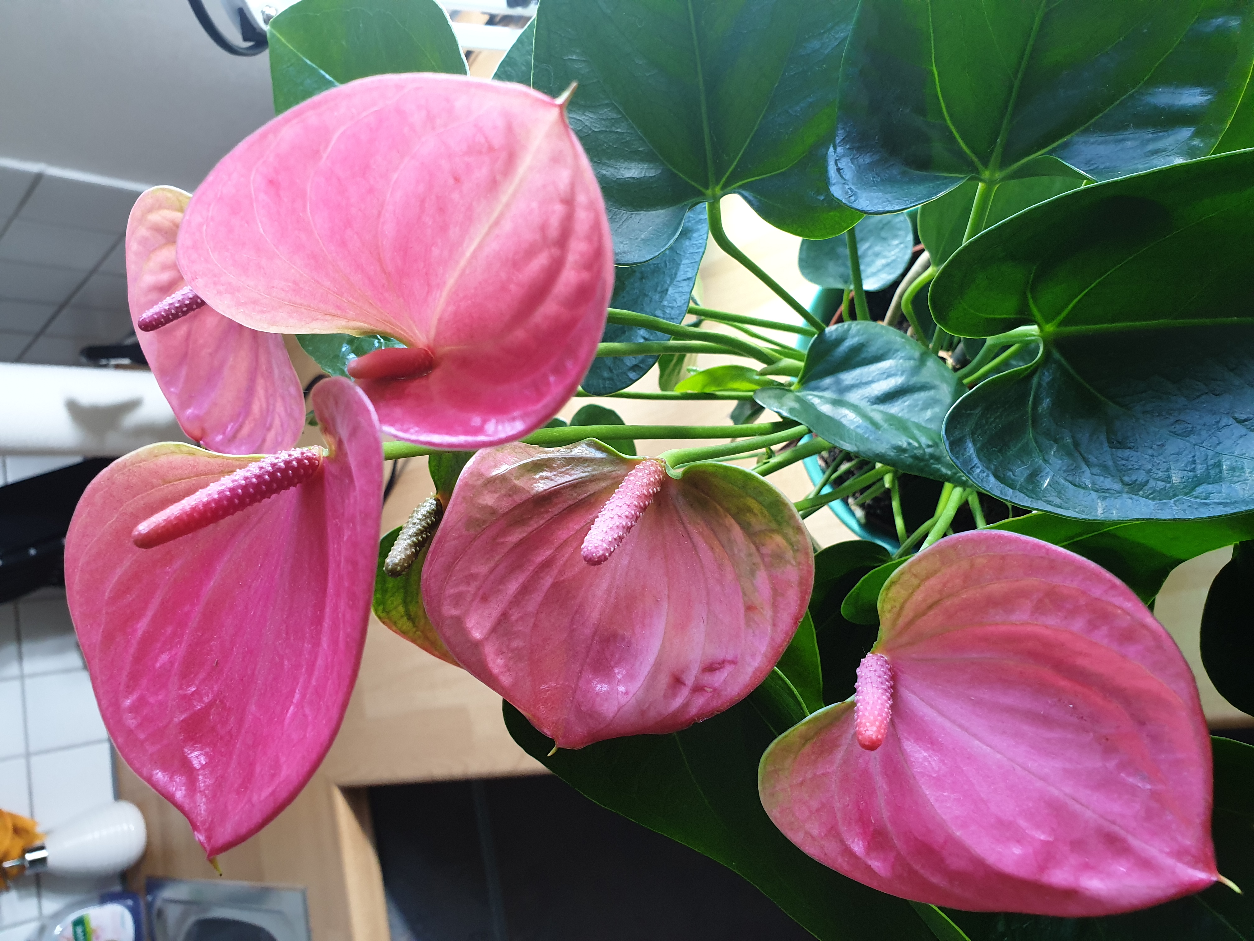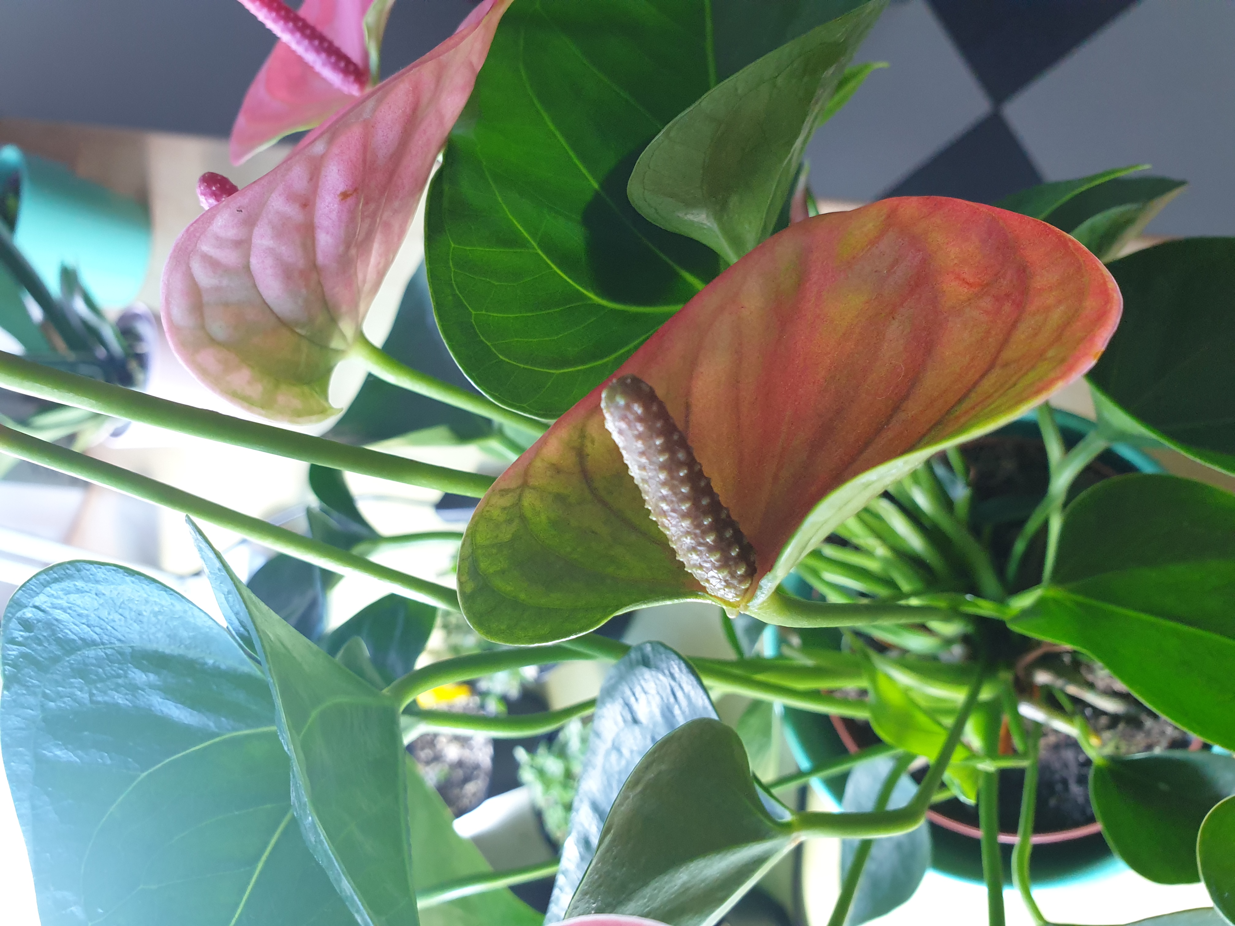 Ich bin zufällig aktuell im Besitz von zwei blühenden Flamingoblumen / Anthurien und da habe ich mich gefragt, wie und ob man diese mit der Hand bestäuben kann. Ich sehe zwar, dass es bei einigen auf dem Kolben gelbe "Veränderungen" gibt aber es lassen sich keine Pollen oder sonst etwas entnehmen. Ich habe mal alle Blüten der beiden Pflanzen abfotografiert. Es löst sich einfach nichts. Vielleicht hat ja jemand Tipps? Oder eine Anleitung? Woran sehe ich wann sich die Pollen entnehmen lassen bzw. muss ich die einfach von Kolben "ernten"? Danke!