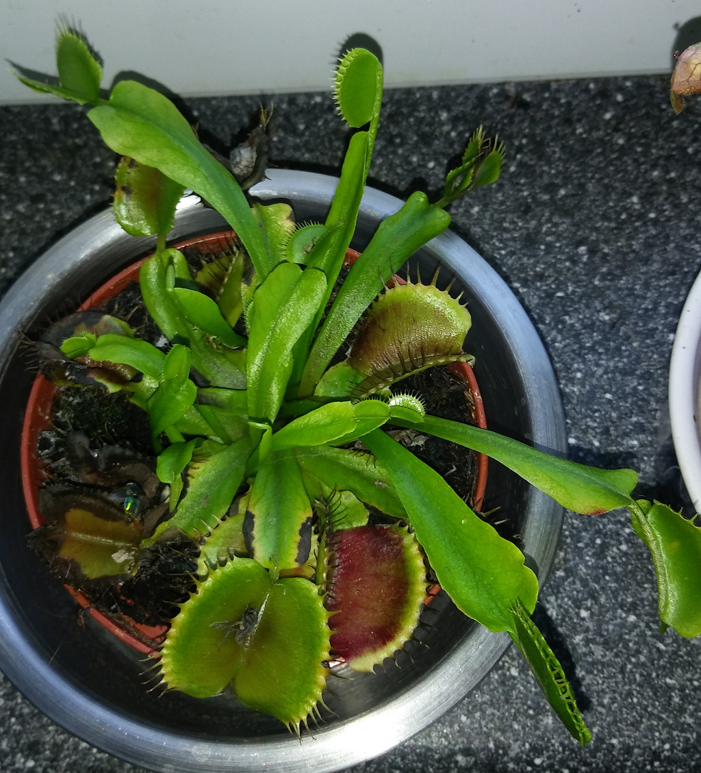 Die Venus sieht im moment am schlimmsten aus. Weiß nicht wie gut man es auf dem Bild erkennen kann.. Viele der älteren, unteren Fallen sind oder werden tot und schwarz, eine Falle ist samt gefangener Fliege verschimmelt und bei anderen fängt die Falle an, an der Stelle schwarz zu werden und abzusterben, wo die gefangene Fliege hängt. Sie scheint aber nicht wirklich in Gefahr zu sein, weil viele neue Fallen nachkommen.