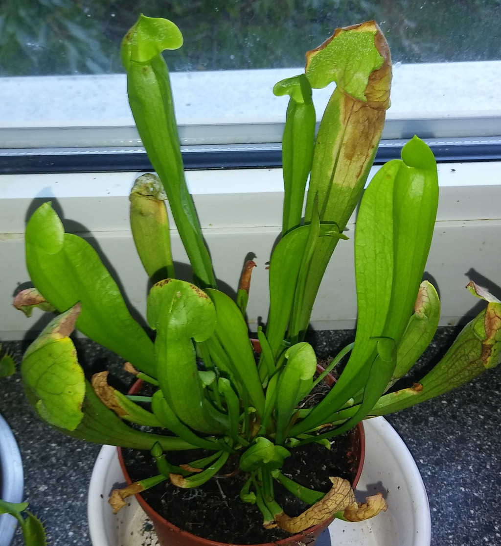 Standort in der Küche am Südfenster, wo es bis vorgestern noch etwas eng war, weil noch zwei Mini-Anzuchthäuschen dazwischen standen. Gegossen werden sie mit destilliertem Wasser, sitzen aber leider noch in den Verkaufstöpfchen. Bin noch nicht dazu gekommen, sie umziehen zu lassen. Möchte das heute noch erledigen, Carnivorenerde hab ich besorgt. Nepenthes und Sarracenia bekommen mehr Wasser und haben dann auch schon mal 2-3 Tage nasse Füße, die Venus halte ich etwas trockener. Also nicht richtig trocken, aber auch nicht so klatschnass. Gegossen wird von unten, in die Katzenschüsseln, in denen sie zur Zeit noch stehen.
