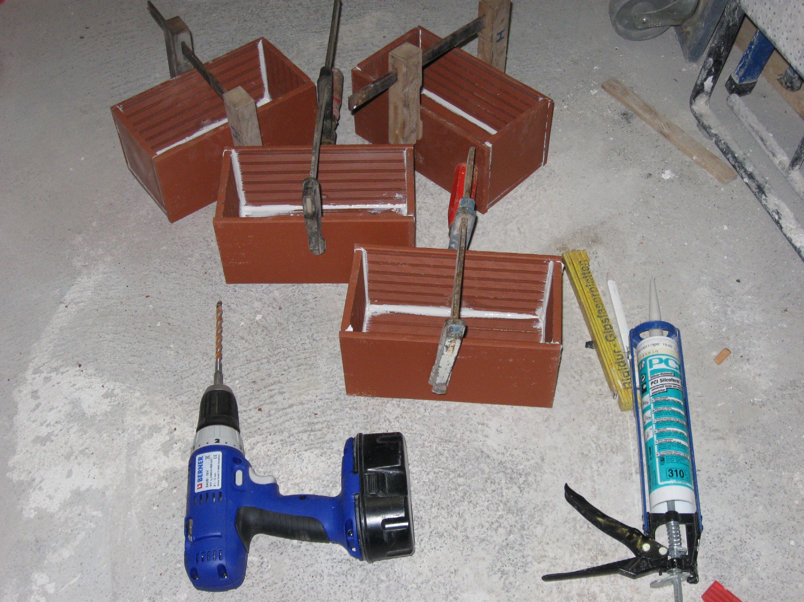 Ich hab wieder Fliesenreste gefunden und innerhalb von gut 1 Stunde diese 4 Pflanzen....ähmm....behälter zusammengeklebt. Leider hatte ich kein dunkles Silicon parat, aber innen ist es ja eh wurscht und außen sieht man nur die Fugen.