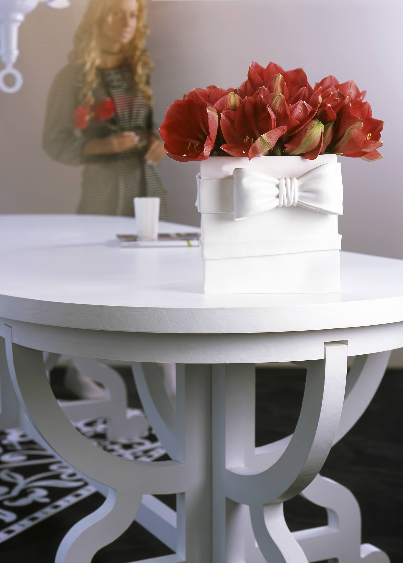 Die extravaganten Trompeten der roten Amaryllis stehen in interessantem Kontrast zu der strengen Vase, die mit einer romantischen Schleife verziert ist. Der Tisch von Marcel Wanders verbindet historische Elemente mit zeitgenössischem Design.
