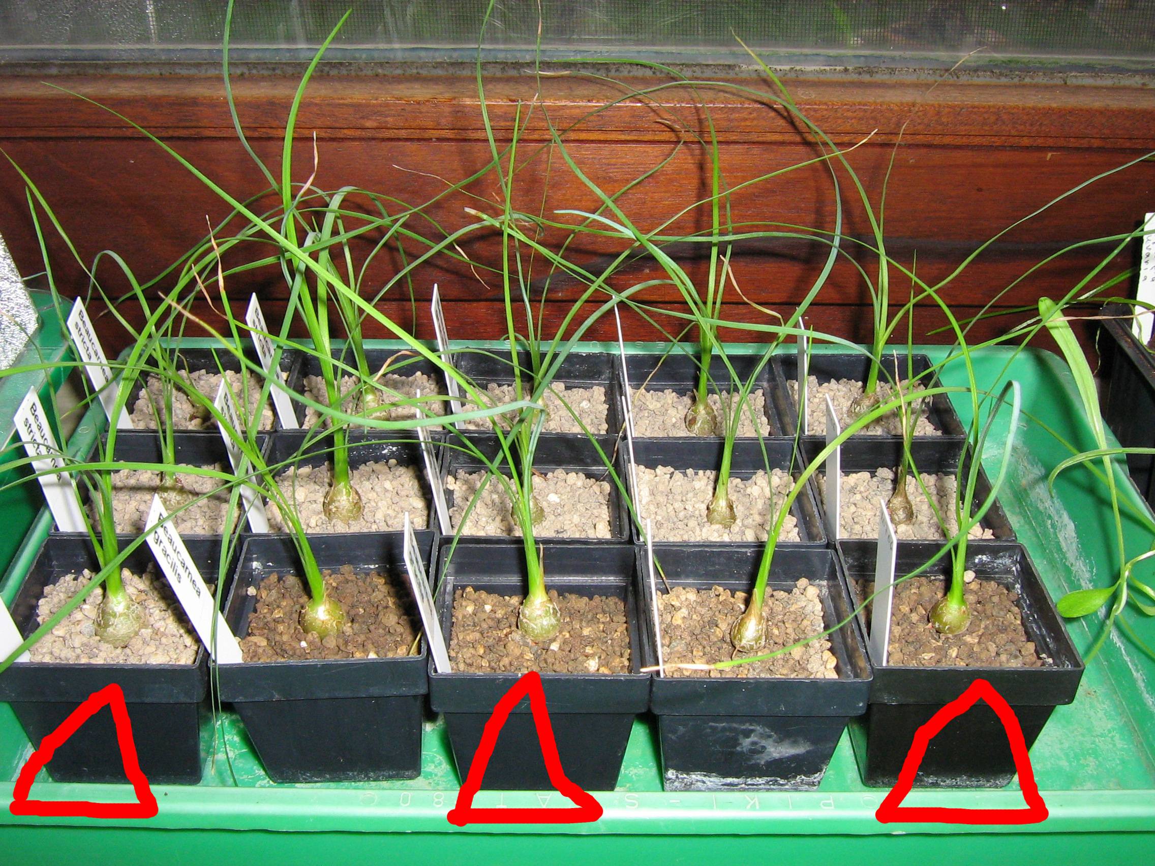 Es handelt sich um einjährige Pflanzen, die in rein mineralisches Substrat gepflanzt sind. Sie befinden sich in Kleingewächshäusern und wurden mit einer schwachen Düngerlösung gegossen. Die rot gekennzeichneten Reihen erhielten zusätzlich FS ins Gießwasser in der Dosierung 1 Tropfen auf 2 Liter.