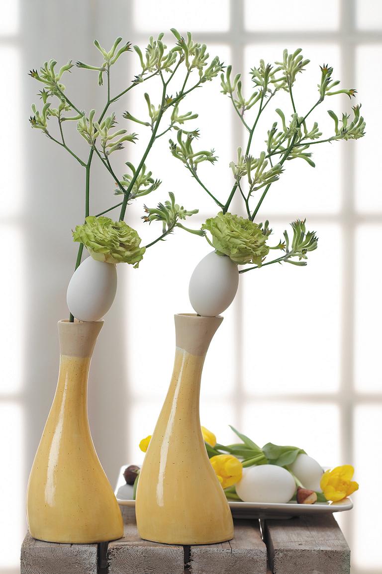 Die kleinen Wachteleier kann man z.B. prima auf Zweige aufspießen. Ebenfalls schön anzuschauen, ist ein durch ein ausgeblasenes Hühnerei gezogener Blütenstiel. Selbst als Minivasen eignen sich ausgeblasene Eier hervorragend, wenn die Löcher der Unterseite mit einigen Tropfen Kerzenwachs versiegelt werden. Um den kleinen Eiervasen Halt zu geben, kann man sie z.B. in eine mit orangefarbenen Linsen gefüllte Glasschale setzen. Dann einige Blumen hineingesteckt und fertig ist ein Eierspektakel der besonderen Art. Ebenfalls sehr schön sieht es aus, wenn man einen Frühlingsstrauß in einer Glasvase präsentiert, in deren Wasser einige Eier schwimmen. Lassen Sie Ihrer Eier-Fantasie freien Lauf und genießen Sie ein rundum frohes Osterfest.