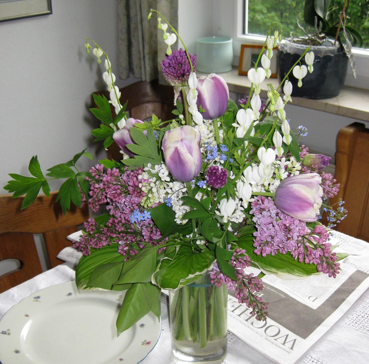 Ranunkeln, Leinkraut, Stauden-Lein, Tulpe 'Queen of Night', Gewürz-Salbei 'Tricolor', Tränendes Herz rosa und Sorte 'Alba', Wilde Schafgarbe und außen Blätter von Astilben.