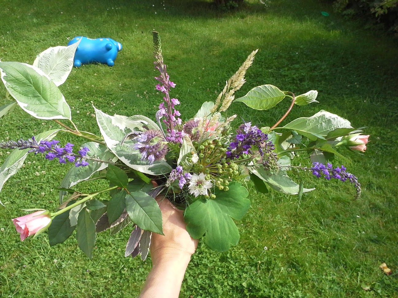 Rosa Röschen vom A..., Weißbunter Hartriegel, Blätter von der Akelei, Salbei Sorte Tricolor, Lila Leinkraut, Bienenfreund, Jungfer im Grünen, verblühter Iran-Lauch und irgendein wildes Gras.