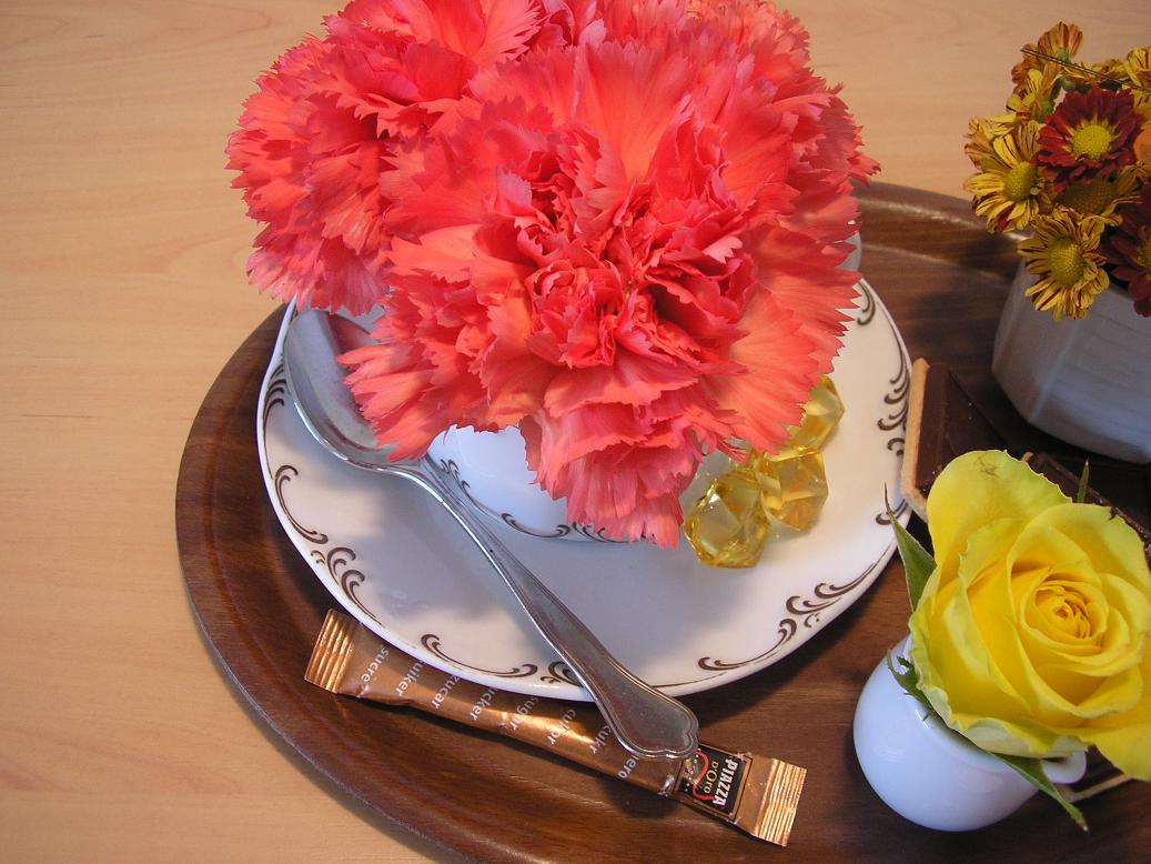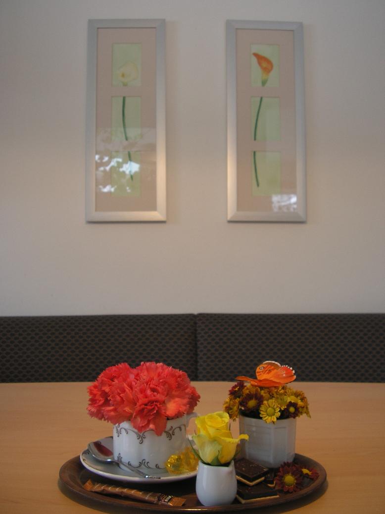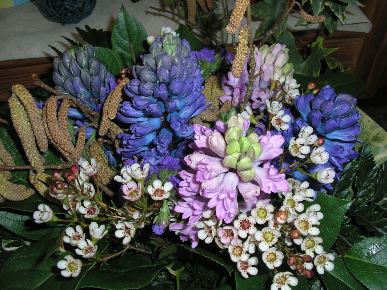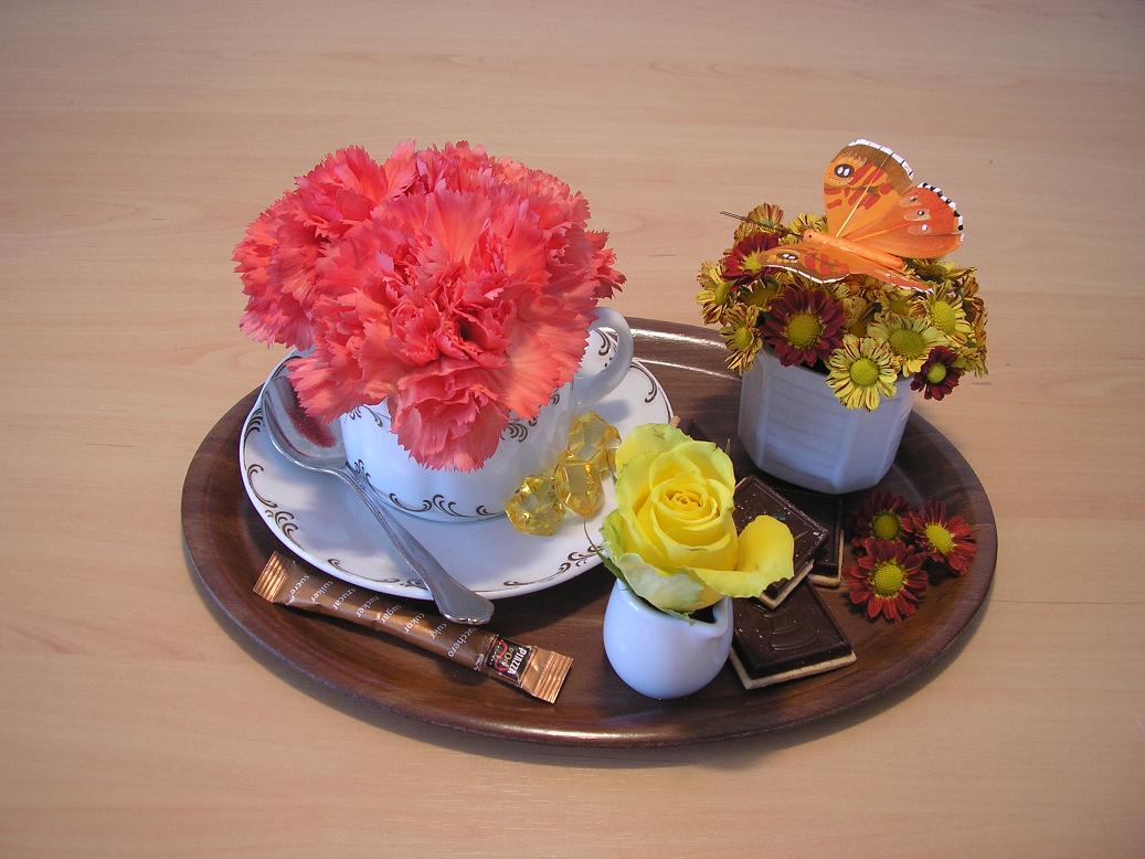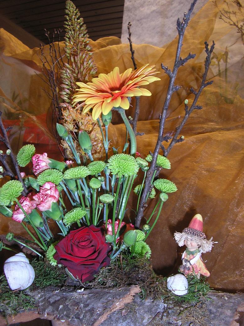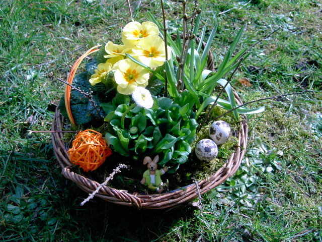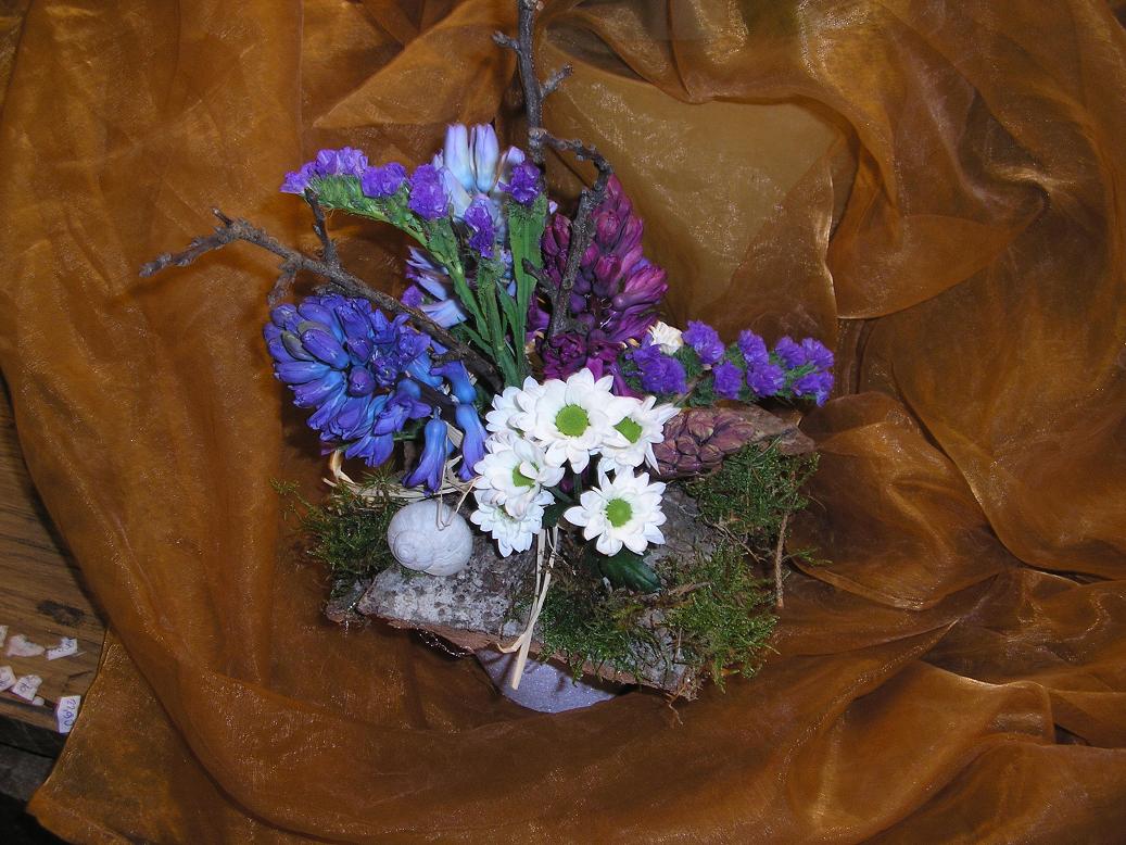 Als nächstestes werden in den Schwamm Äste (hier Prunus) und Blumen gesteckt, je nach Belieben etwas versetzt. Die Zwischenräume kann man dann noch mit Moos ausfüllen damit der Schwamm nicht durchschaut.
