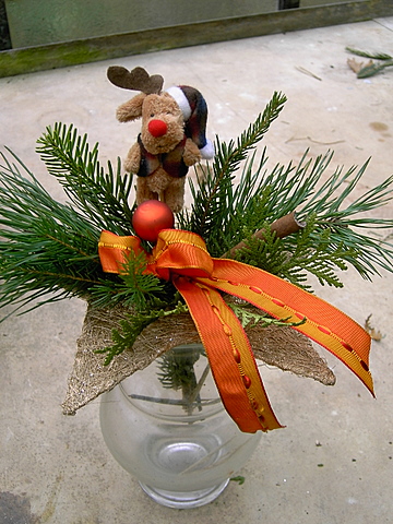 Ein rustikales, aber modernes Gesteck für einen kleinen, schlichten Topf, mit Rindenstücken und Ästen.