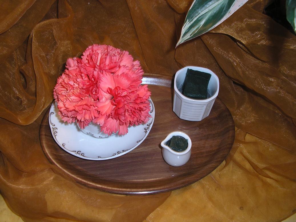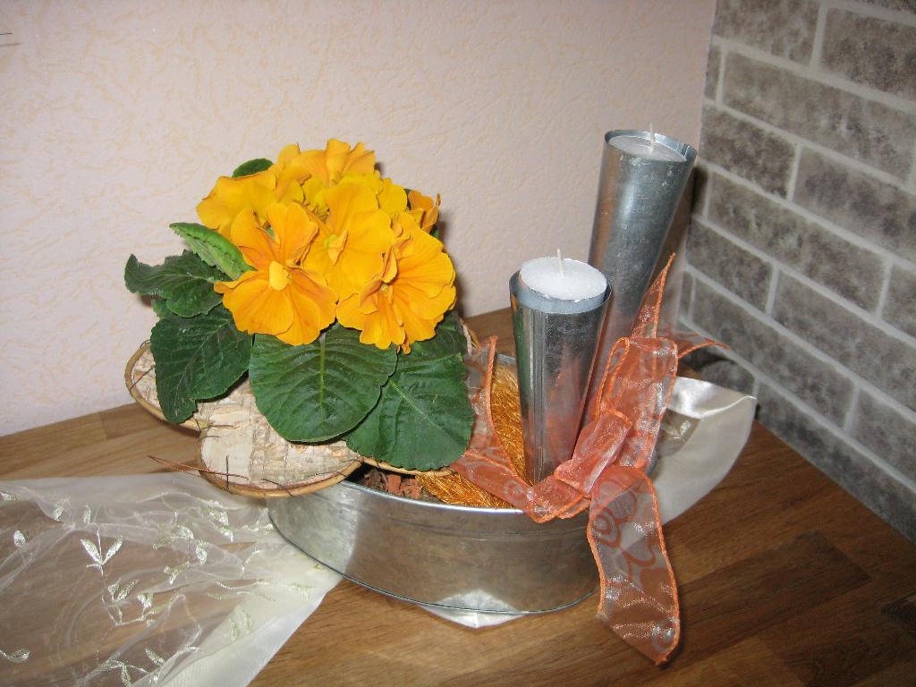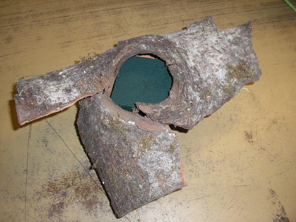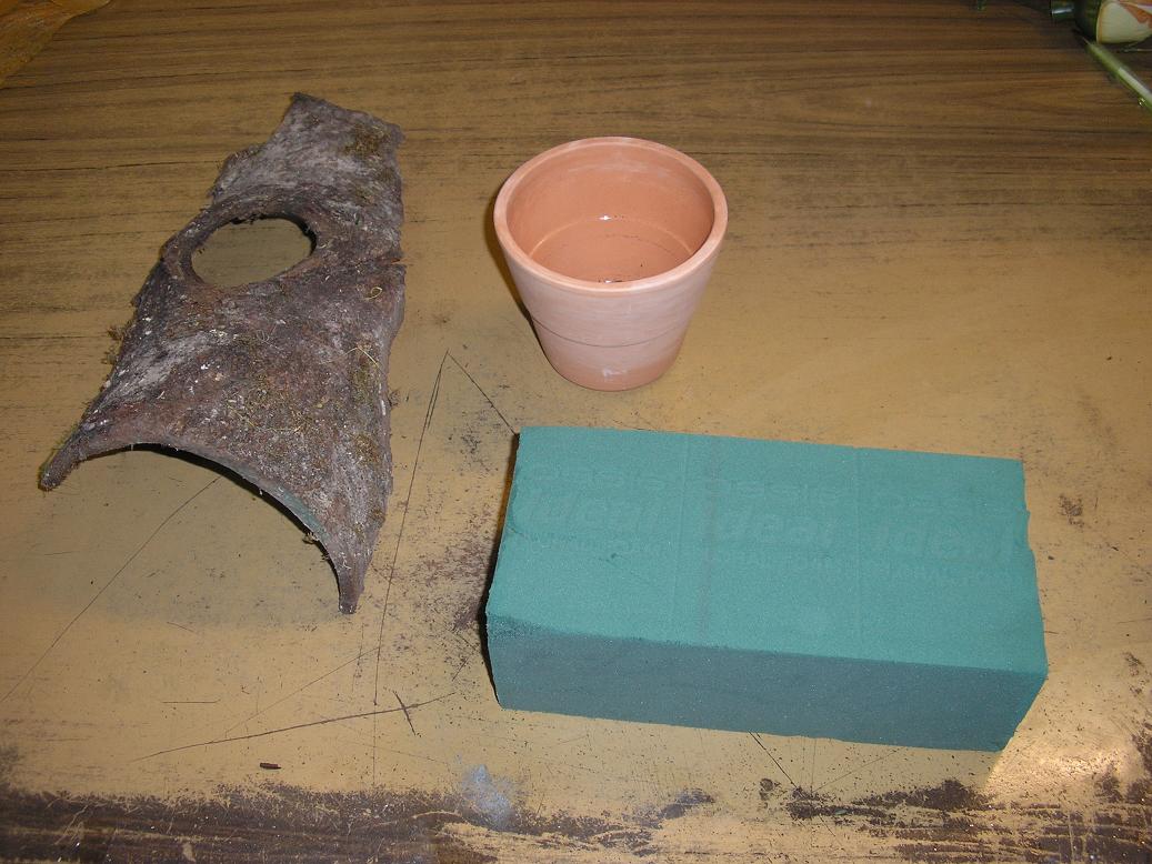 Man nimmt dazu einen nassen Steckschwamm (Oasis) und schneidet ihn genau so, dass er in den Topf passt. Dann klebt man an den oberseitigen Rand des Topfes, mit Heißkleber, größere Rindenstücke fest, die den Topf von oben gesehen verdecken... Die Seite des möglichst schlichten Topfes darf man aber ruhig sehen.