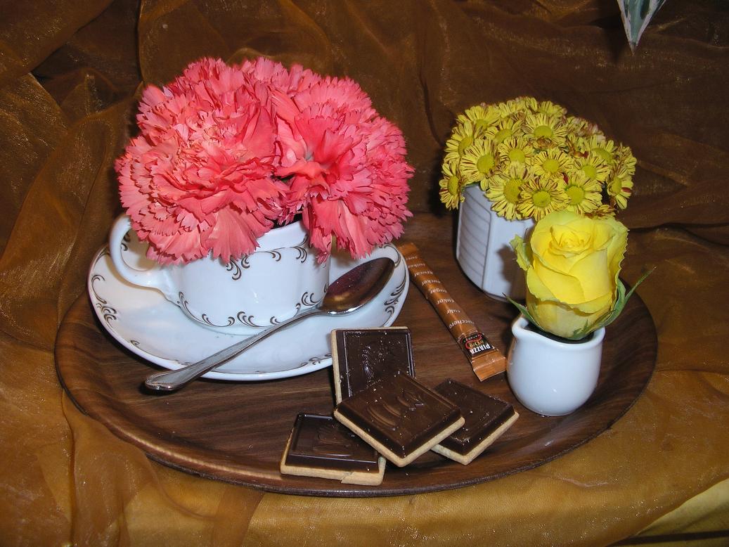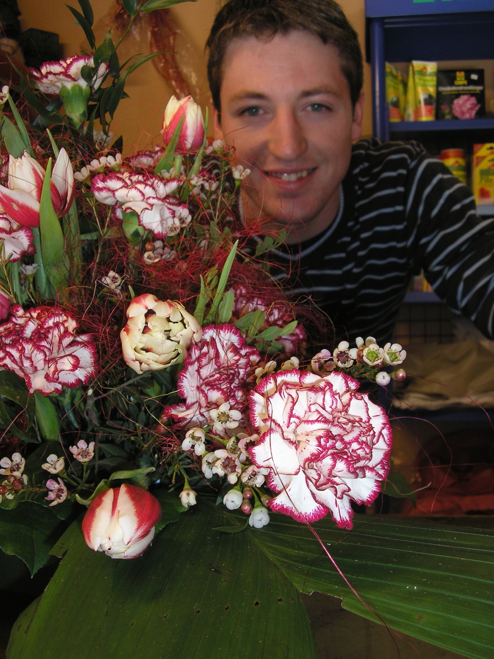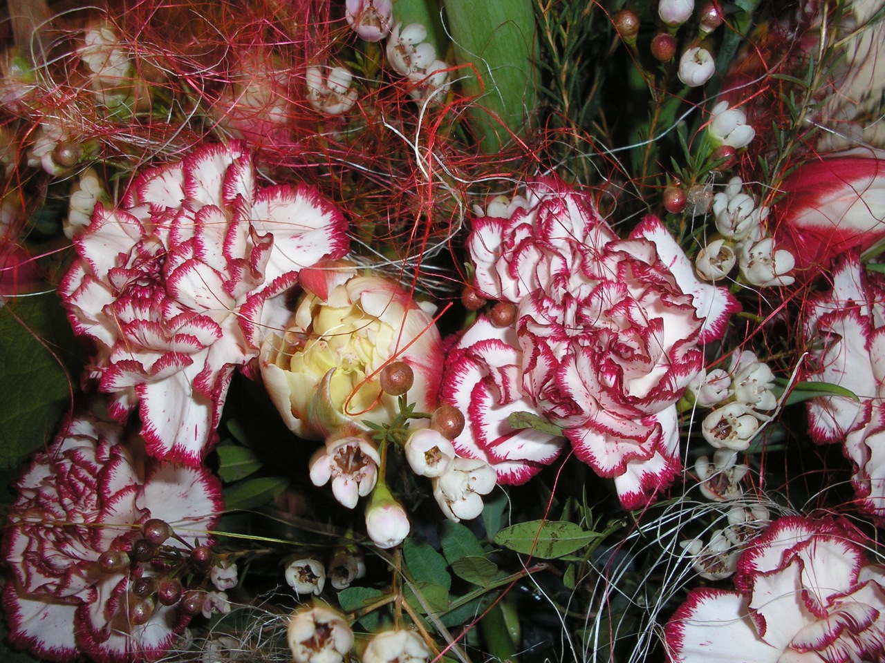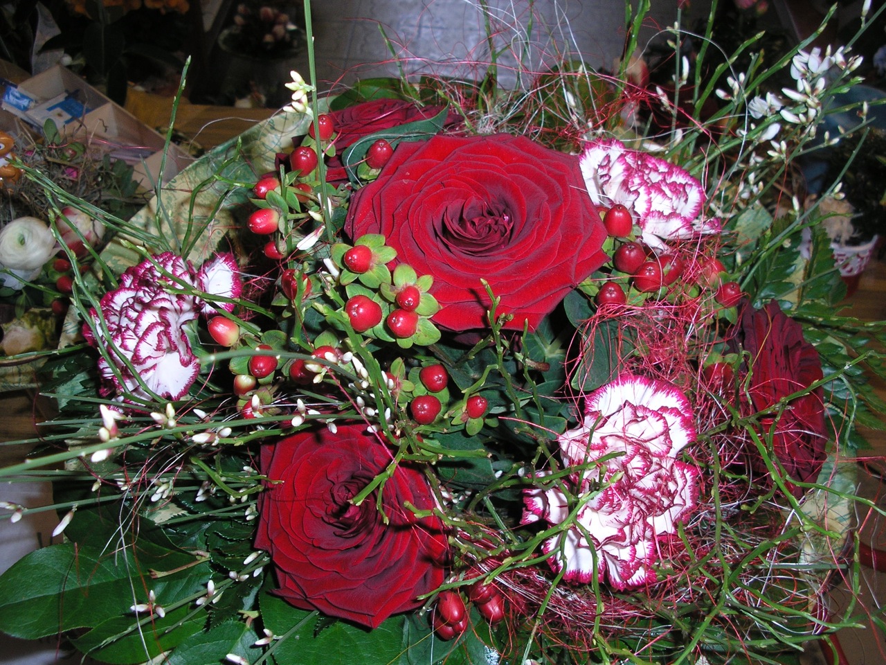 Ich habe hier zu den Blumen (Eremurus, Gerbera, Rose) anstatt grünen Blättern, die grünen Blüten von Chrysanthemen (Santini) gegeben um das ganze etwas moderner zu machen.
