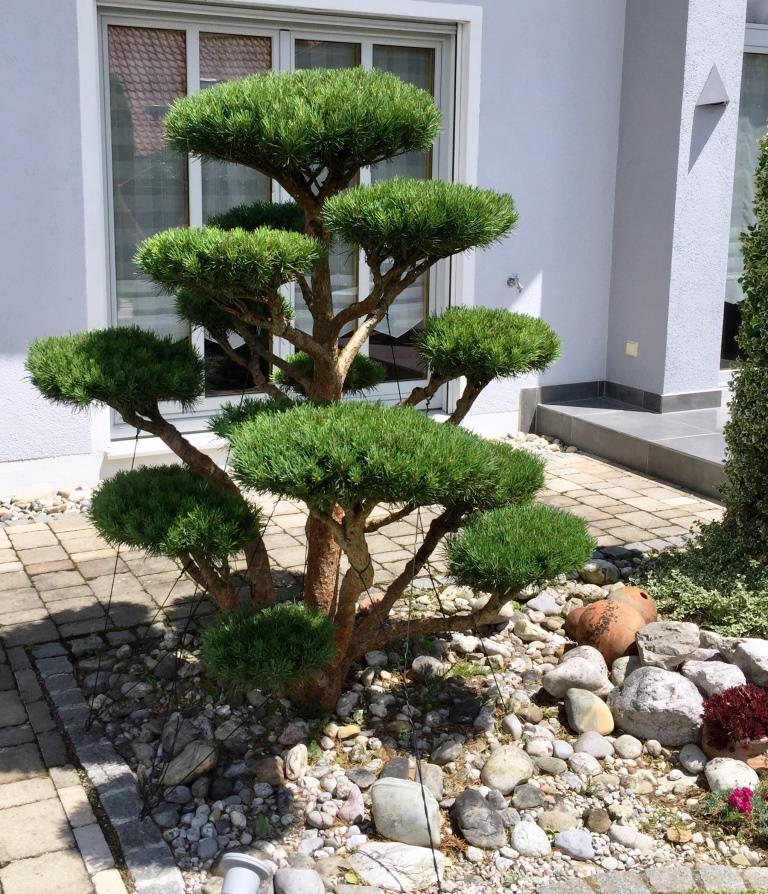 Kiefern lassen sich meiner Meinung nach nur schwer in Perfekte Formen Pressen (das geht bei Buchs, Zypressen und Eibe besser) bei Kiefern finde ich eine Natürliche Struppigkeit schöner als ganz glatte und perfekte Rundungen.