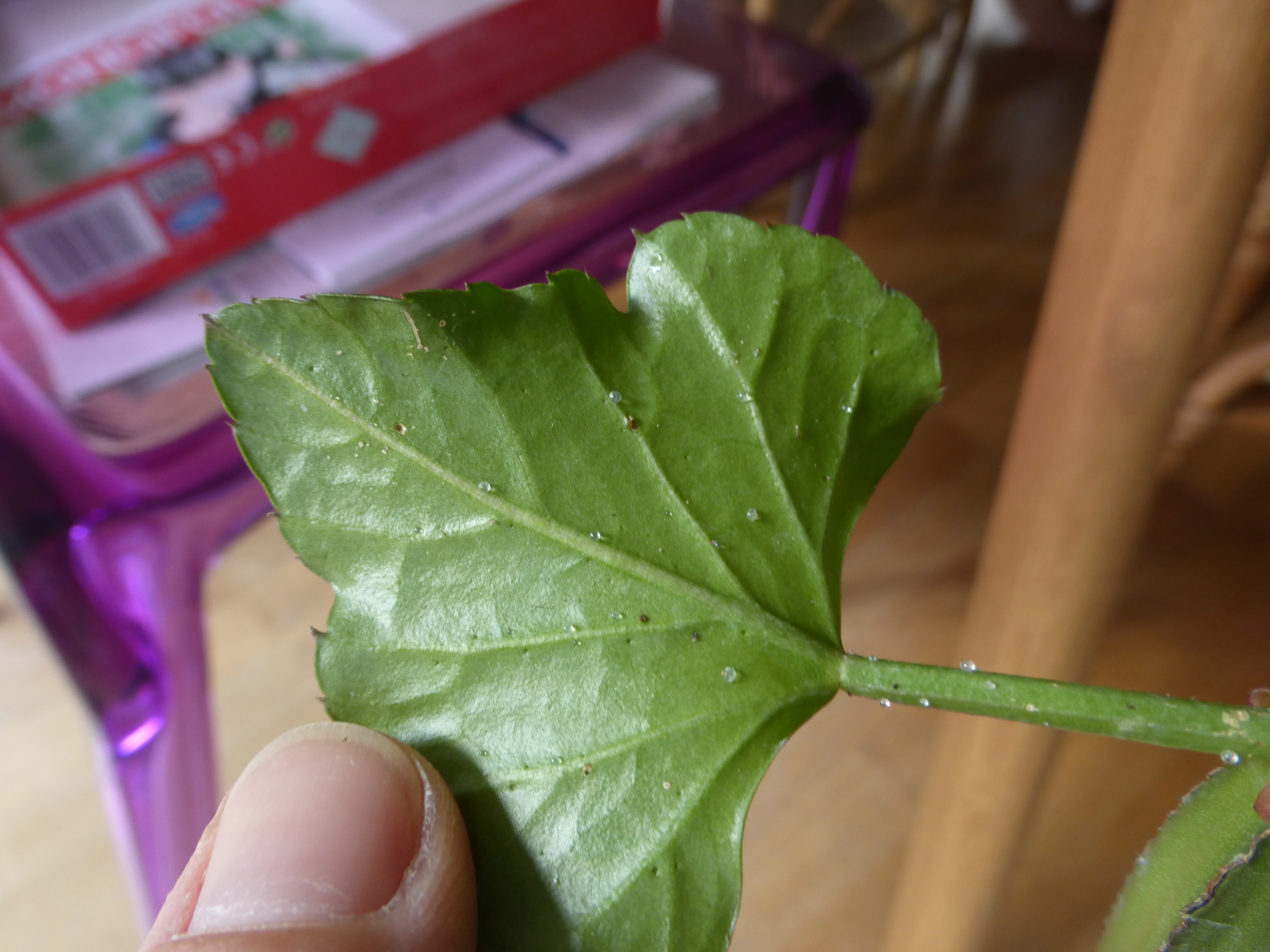 Schon von Anfang an hat diese Pflanze immer wieder kleine weiße Kristalle und kleine schwarze Punkte sowohl an den Blättern als auch an den Stängeln. Es sieht nicht aus wie ein Schädling!