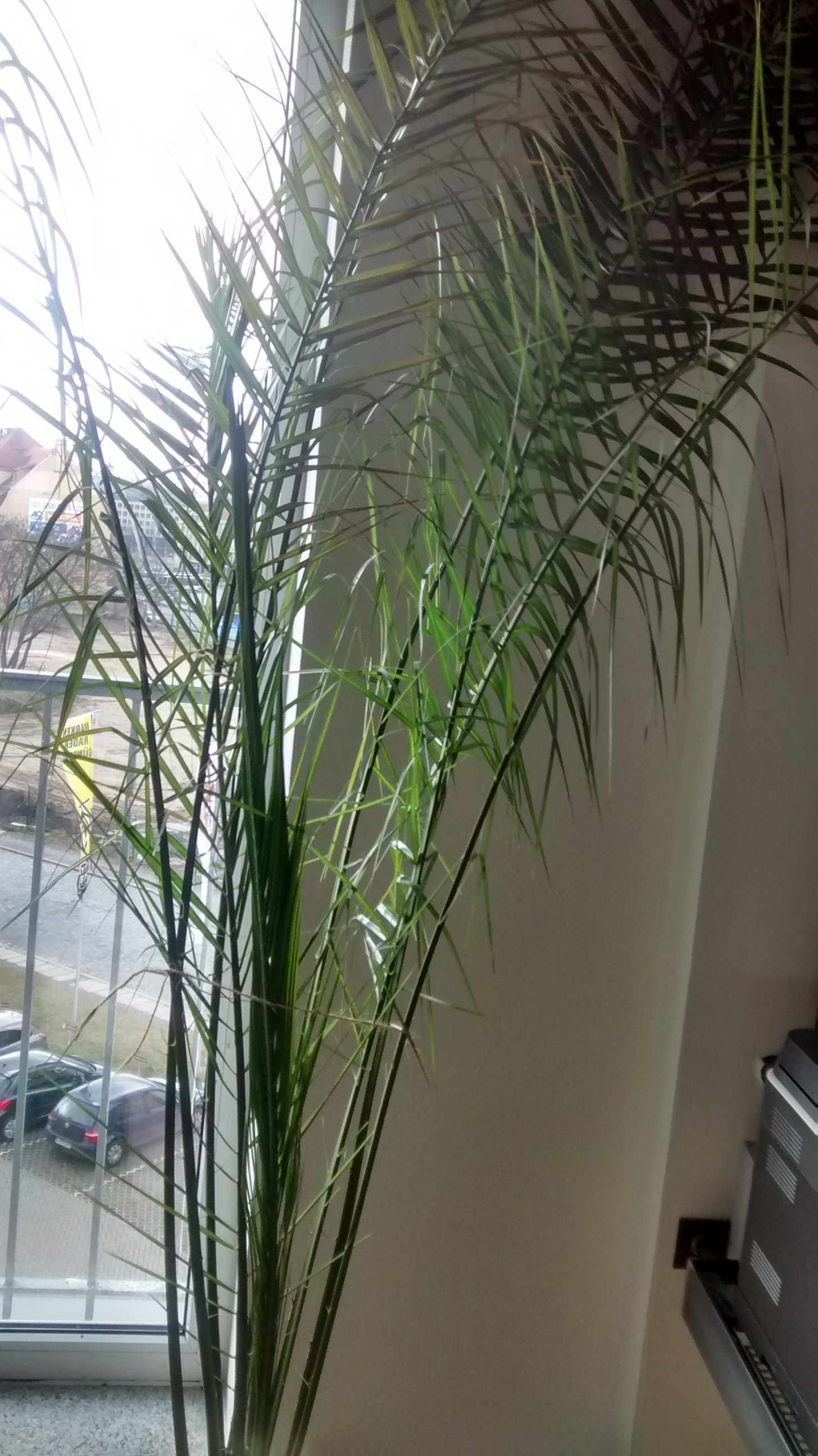ich habe vor einiger Zeit eine etwa 3m hohe Phönixpalme erworben (ich denke jedenfalls, dass es eine ist). Seitdem ich diese ins Büro umgezogen habe, werden vermehrt Blätter braun oder bleiben grün, vertrocknen aber. Bilder der Pflanze habe ich angehangen.