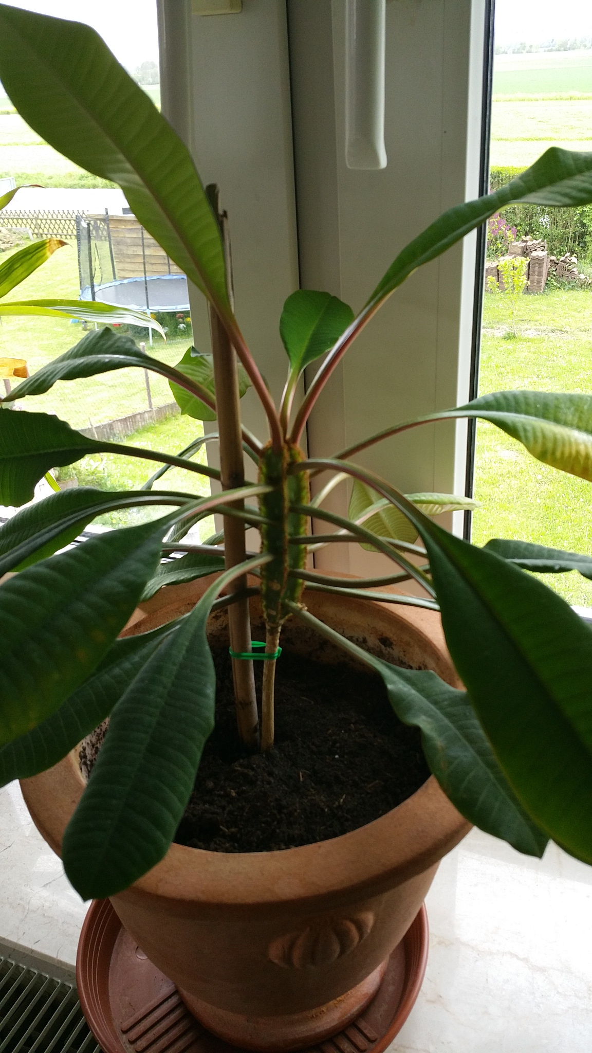 Vom Blatt her tippe ich auch eine Frangipani-Art aber bei mir ist der Stamm ist ganz anders... Ich hänge mal 1 Bild mit an.