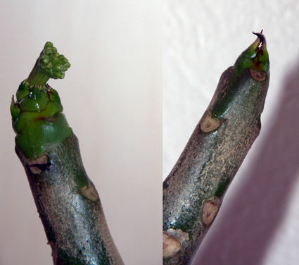 Nur habe ich über die Vermehrung mittels Steckling nur etwas von Stecklingen gelesen, die ca. 20cm lang sind. Mein Steckling ist aber insgesamt 65cm (!) lang, die oberen 10cm gabelt er sich in 2 Spitzen, die mittlerweile auch schon austreiben (er musste leider eine Woche aufs eintopfen warten, wg. Dienstreisen). Foto hänge ich an.