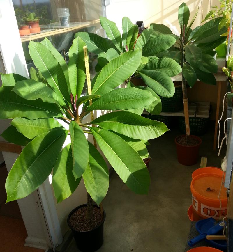 ich lese hier, dass bei Euch schon die Blätter abfallen. Meine stehen alle noch auf dem offenen Balkon (die Nacht vom 26.09. zum 27.09. war es bis auf 2,5°C runter gegangen) und einen Blätterabwurf konnte ich bisher nur vereinzelt bei den kleinen Plumis registrieren. Die Bilanz für diese Jahr ist mit einem Höhenzuwachs von 30-42 cm auf bis zu knapp über einen Meter auch nicht schlecht nebst vielen großen Blättern. Für eine Blüte reichte es aber leider doch noch nicht. Nächtes Jahr März sind sie dann 3 Jahre alt und mal schaun ob es dann in 2014 was wird. Gruß Norbert
