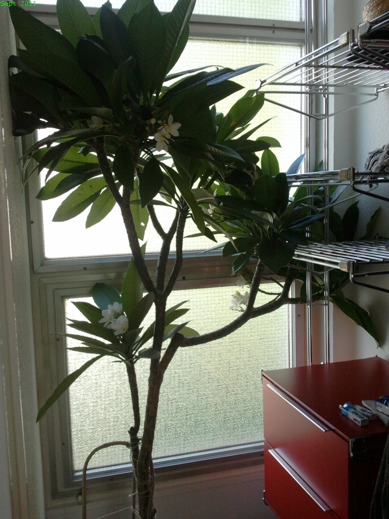 Hmmm - soo leid mir die Blüten ja auch tun - aber das vergangene verlängerte und noch trockene Wochenende habe ich nun doch genutzt, die Plumies wieder reinzuholen und sie auf ihren Überwinterungsplatz zu stellen. Ich hatte schon im September angefangen, weniger zur gießen, um die Plumies auf die kommende Trockenzeit vorzubereiten, aber die Knospen wurden trotzdem weiterhin größer und wurden zu Blütendolden. Seit die Plumies drin stehen, werden fast jeden Tag von unten beginnend Blätter gelb und fallen ab, so, als ob sie nur darauf gewartet hätten, ein Signal dafür zu bekommen. Für mich gibt es jetzt weiter nichts zu tun als abgeworfene Blätter und Blüten aufzusammeln, einmal im Monat etwas Wasser zu geben und die nächsten 7 (!!!!) Monate abzuwarten.....