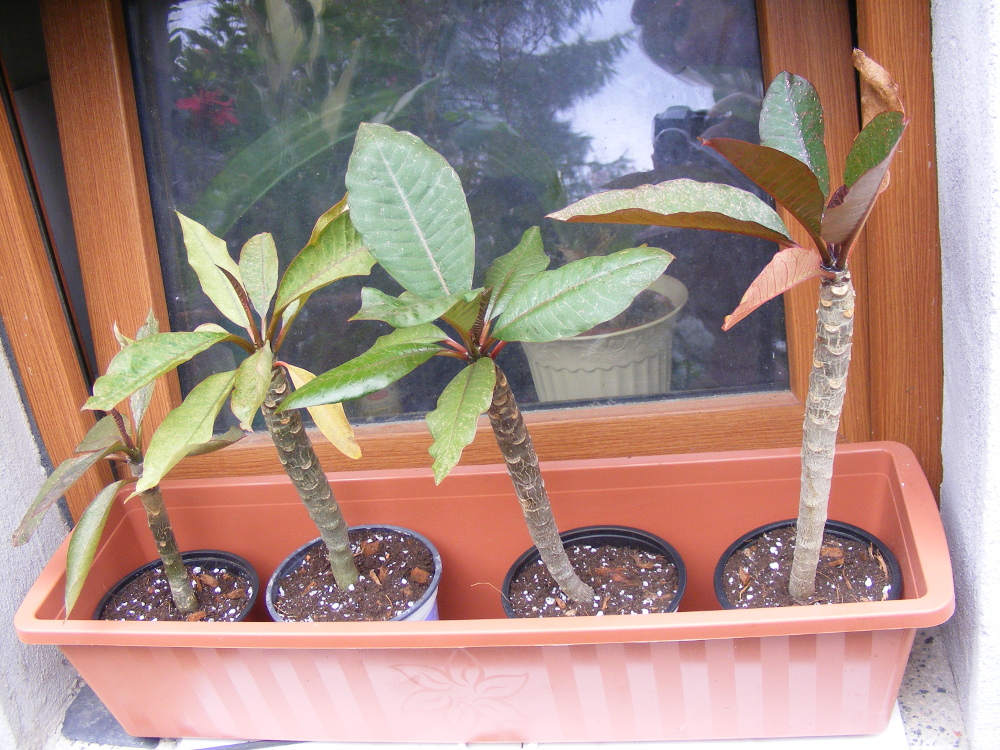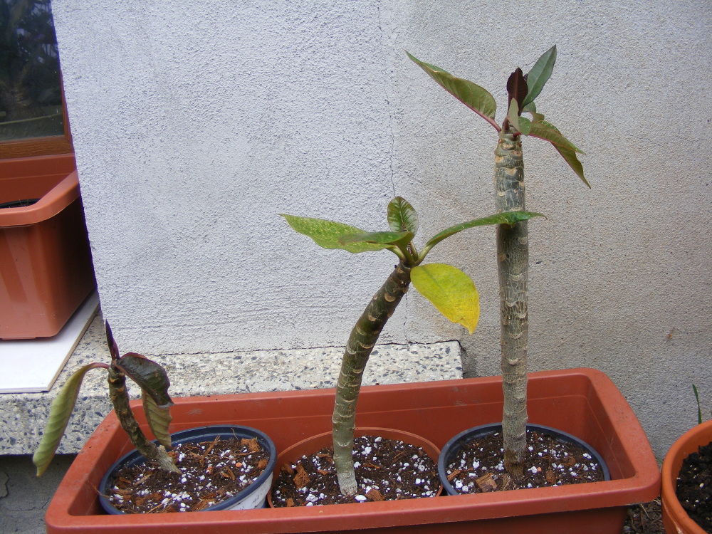 So schöne Blütenbilder! Ich werde mich wohl noch gedulden müssen. Hier meine Plumis, welche ich im Frühjahr 2012 gesät hatte. Die Namensschilder waren indessen verblichen, aber das macht nichts. Werde mich einfach überraschen lassen. Sie stehen seit Mitte Mai draußen im Fensterbrett. Da werden sie nicht zu nass, bekommen aber volle Sonne.