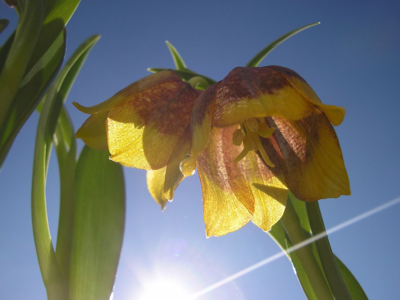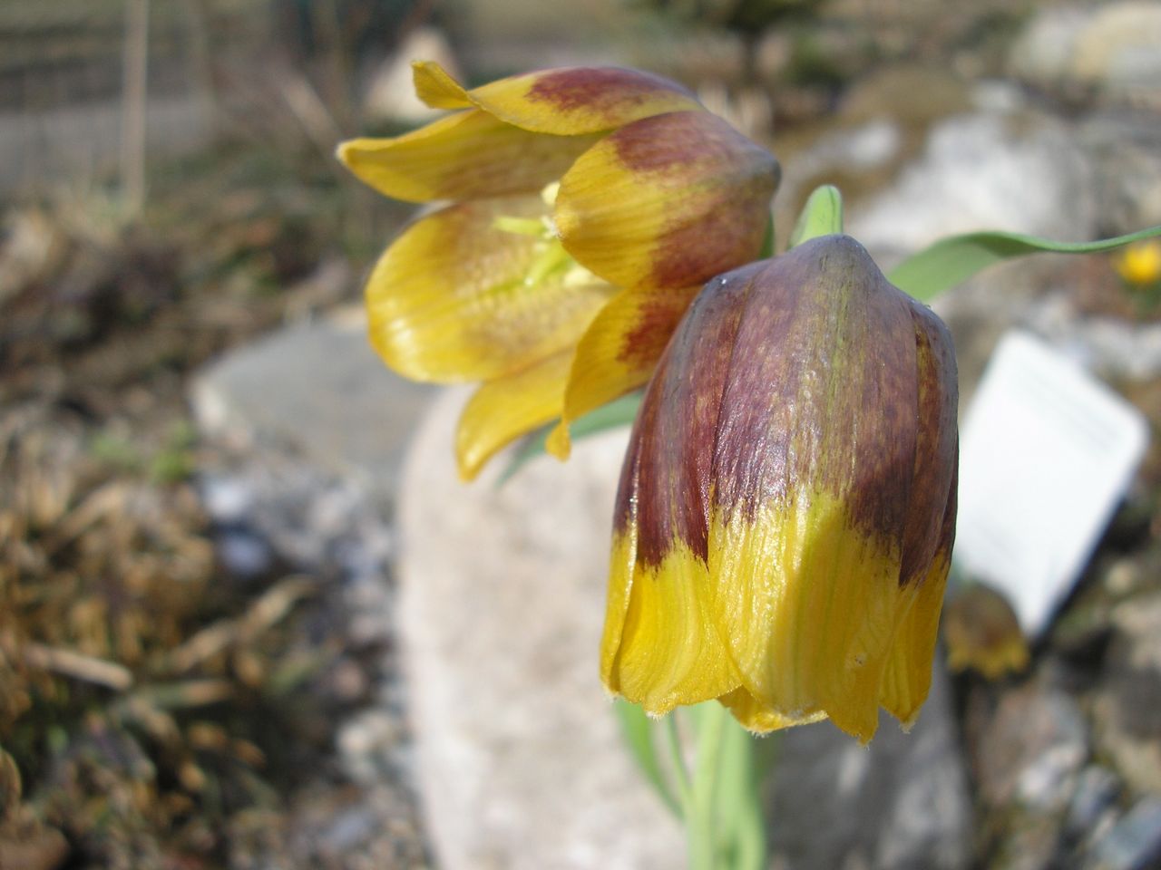 Blütenbeschreibung: Braunpurpurne Glockenblüten, innen gelb getönt und auch an den Außenseiten ein deutlicher gelber Rand um die Öffnung der Glocken, alleine, zu zweit, oder zu dritt an den Stengeln