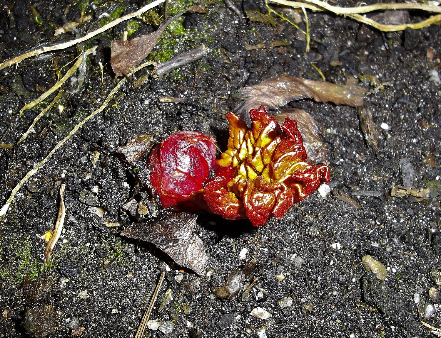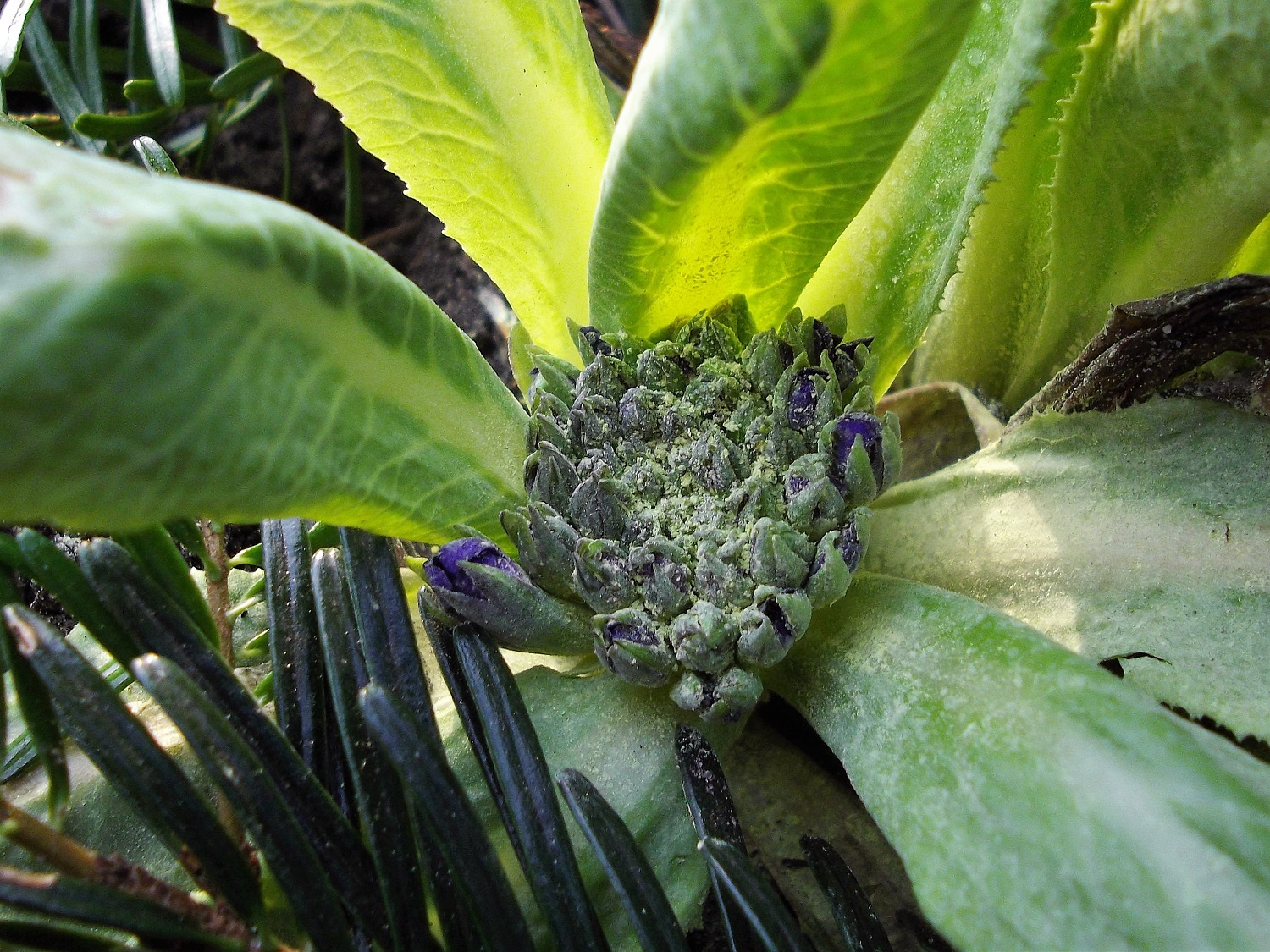 Also mal im Garten unter die noch vorhandene Schutzschicht aus Tannenzweigen gelinst und siehe da: es tut sich einiges!