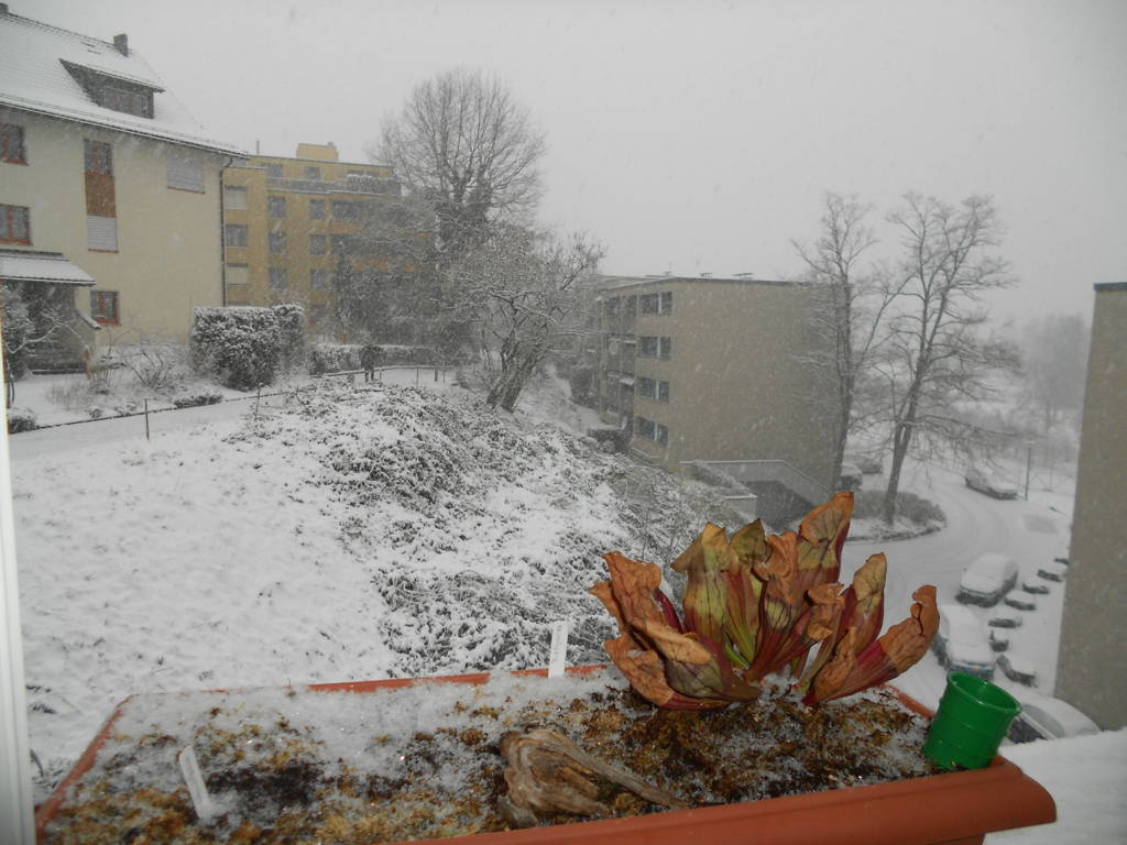 Amoebius: Richtig erkannt Das ist mein Möörchen- Minimoor aufm Fenstersims. Die Pflanze ist eine Sarracenia purpurea var venosa, welche jetzt bereits den zweiten Winter draussen überstanden hat. Da ich das Möörchen erst letzten Herbst eingerichtet habe, schauts noch sehr leer aus.