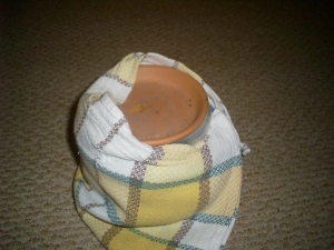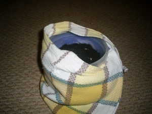 Also zuerst sucht man sich ein Gefäß, das größer ist als das Pflanzgefäß und möglichst dicke Wände hat. In dieses gibt man heißes Wasser, stellt dann das Pflanzgefäß dort hinein, wickelt das ganze mit einem Tuch rundum ein, damit die Wärme nicht so schnell verloren geht und deckt es schließlich ab. Ich habe dazu mal unten Bilder eingefügt.