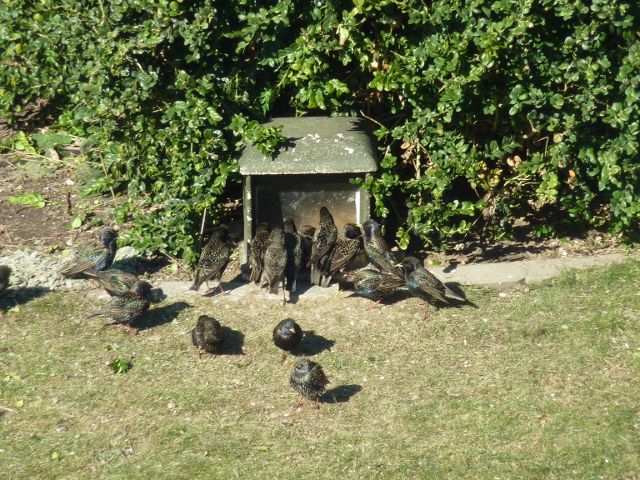 Hier ist auch alles abgeerntet, Insekten und deren Raupen sind noch nicht in Sicht. Die Vögel sind teilweise schon in der Mauser, andere sind gerade von ihrem langen Flug aus Afrika zurück. Soviel Betrieb wie jetzt war schon lange nicht mehr an den Knödeln. Im Moment sind unheimlich viele Schwanzmeisen da, aber auch die Stare futtern bis zum Abwinken.