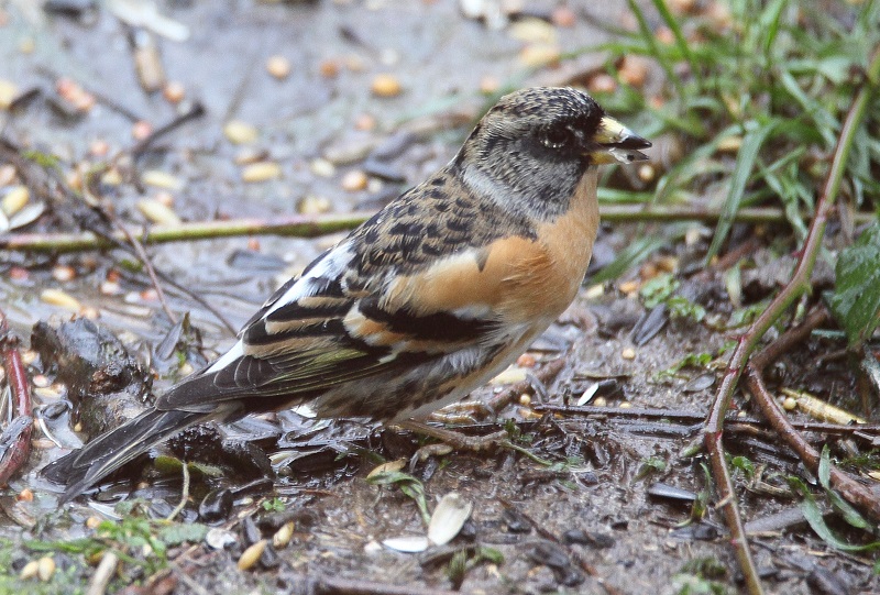 Meisen in Massen, wenige Sperlinge, mehrere Amseln, Ringeltauben, Rotkehlchen, Buch- und Grünfinken, Gimpel und heute früh Bergfink und ich nehme an Erlenzeisig.