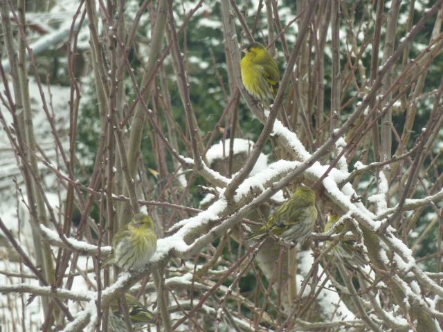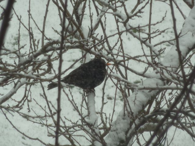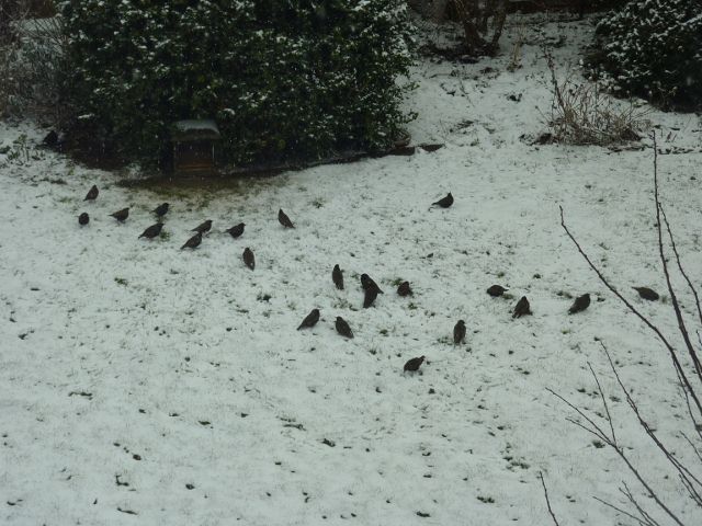 Ich hatte im dicken Schnee ein Schälchen Katzenfutter draußen (Kaninchen) - und wer hat sich drüber hergemacht? eine ganze Amselmannschaft!