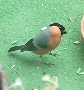 Regelmäßig kommen Rotkehlchen, Blau-und Kohlmeisen, Amseln und seit kurzem kommen auch ein Gimpelhahn und Heckenbraunellen. Versteckt hinter der Efeutute versuche ich oft sie durch das Fenster (und durch die Efeutute ) zu knipsen, mit mäßigem Erfolg