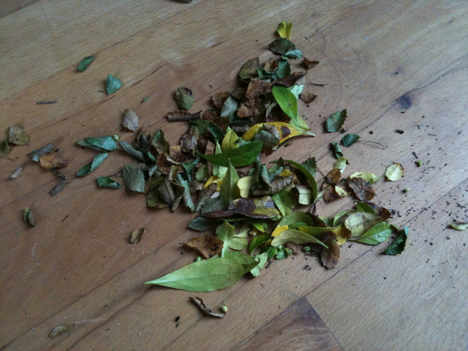 Naja, es handelt sich, wie schon erwähnt, um drei Fukientee und eine Chinesiche Ulme (wahrscheinlich!!). Die Ulme hat trockene, leicht eingerollte, braun-gelbe Blätter, die ich eben mit den gelben Blättern der Fukientee zu einem Häufchen gekehrt und abfotografiert habe..