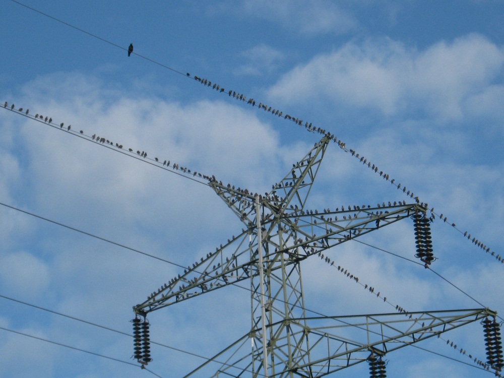 Bei uns lassen sich seit einiger Zeit regelmäßig Stare nieder (zumindest nach dem Gesang zu urteilen würde ich auf Stare tippen). Sie sind fast jeden Tag auf dem Strommast zu sehen. Mit der großen Krähe auf dem Bild erinnerte mich das ganze ein bisschen an den Film "for the birds" von Pixar