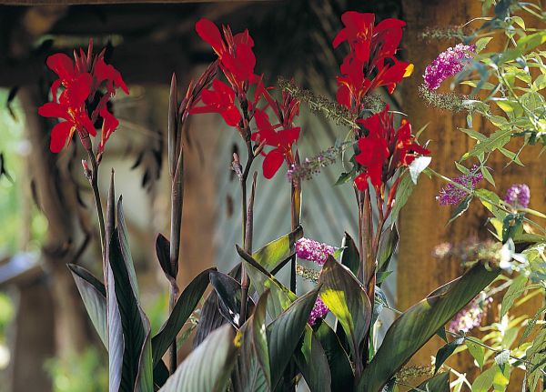 Dunkle warme Farben und Erdtöne vermitteln ein Gefühl des "zu Hause seins" und der Geborgenheit; strukturierte Oberflächen sprechen die Sinne an und machen Gärten, in denen diese Aspekte berücksichtigt werden, zu einem besonderen Erlebnis. Diese gestalterischen Elemente - Formen, Farben und auch Strukturen - finden sich bei den im Sommer blühenden Zwiebelblumen in besonderer Weise. Außergewöhnlich sind z.B. die markanten Blätter des Indischen Blumenrohrs (Canna). Die Adern auf den großen Blättern verlaufen parallel und heben sich etwas vom Blatt ab. So entsteht eine strukturierte Oberfläche mit einem faszinierenden Muster aus Linien, die je nach Sorte etwas dunkler als die Blattflächen sind. Schöne Canna mit mehr oder weniger stark dunkelpurpurrot getönten Blättern und dunklen Blattadern sind z.B. Canna `Wyoming`, Canna `Black Night` und Canna `E. Neubert`.