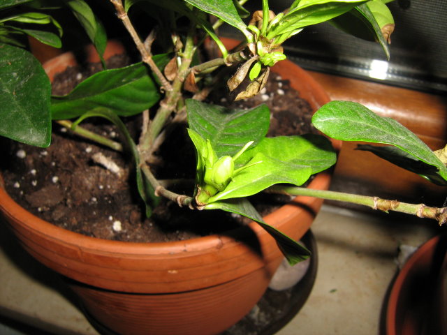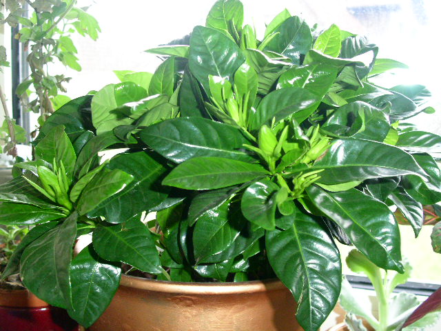 Hier die gewünschte Ganzkörper-Aufnahme meiner Gardenie im Kübel. Das Bild ist mit einer Handy-Kamera aufgenommen, daher etwas unscharf.