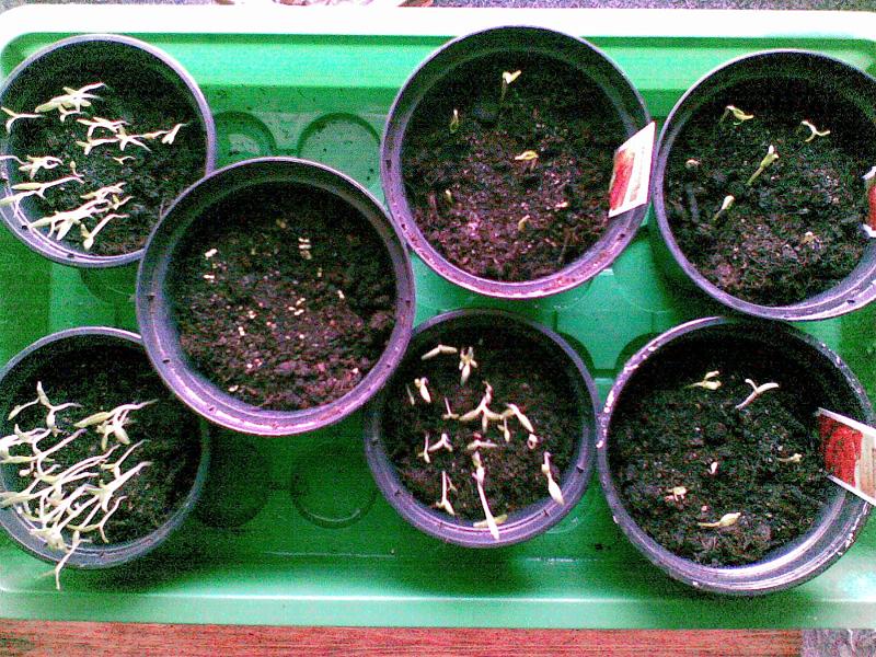 Zumindest waren die Tomaten schon mal die Schnellstarter unter meinen Aussaaten. Da ich mir nicht sicher war, ob da überhaupt etwas keimen würde, hatte ich einfach so eine „Handvoll“ (naja, okay, etwas übertrieben, aber es waren reichlich) Samen in die restlichen 3 kleinen Pötte geschmissen, die noch ins ZGH gerade so hineinpaßten. Tja, und siehe da, wider Erwarten keimten von den Tomaten viele, sehr viele, eigentlich schon viel zu viele Samen (bei einer Zählung hab ich dann bei 64 aufgehört )...