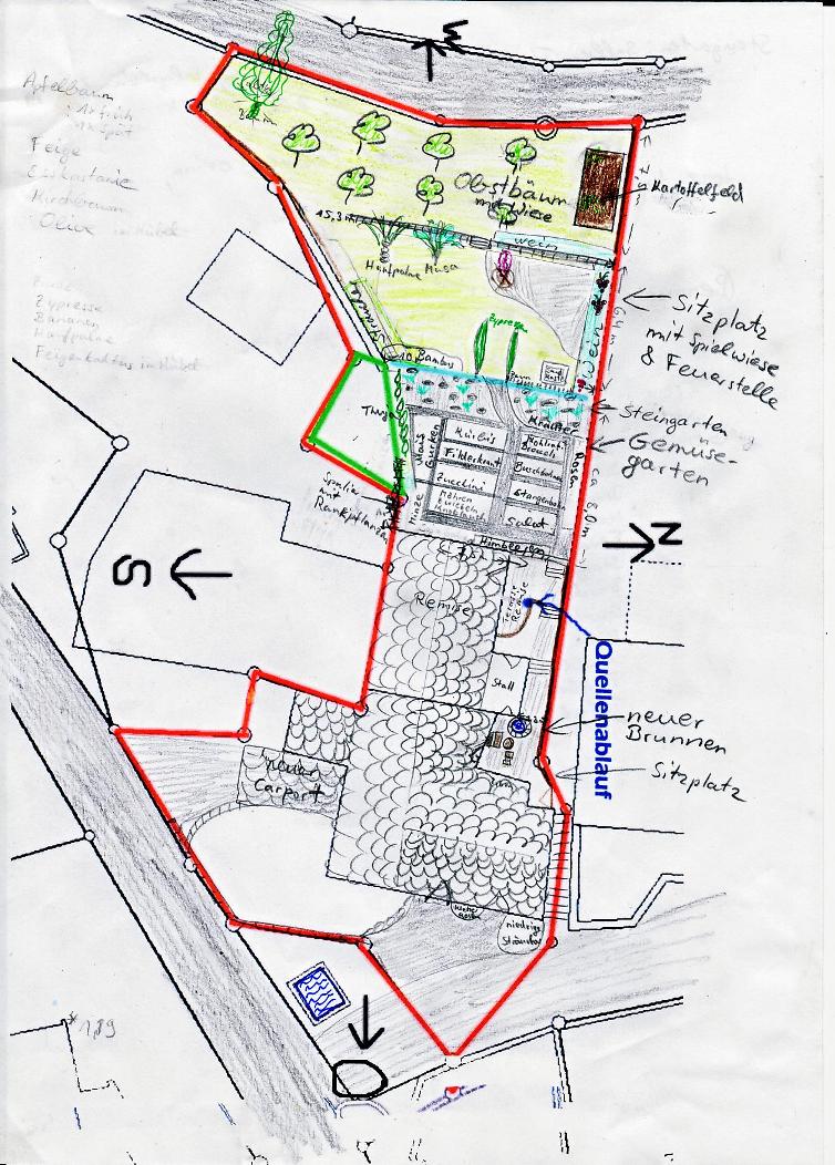 Was den Grenzabstand betrifft, müsste ich mich mal mit dem Schweizer Recht auseinandersetzen. Aber ich denke mal das gibt kein Problem. Diese Sache betrifft ja hauptsächlich meinen Nachbarn links. Und da sind wir nicht so nah dran. An der Remise links liegt das Nachbargrundstück etwa 2 m tiefer als unser Garten und da wo die Thuja stehen sind wir noch weit vom Nachbarn weg. Wenn er später mal das grün gekennzeichnete Grundstück kaufen sollte, steht die Hecke schon.