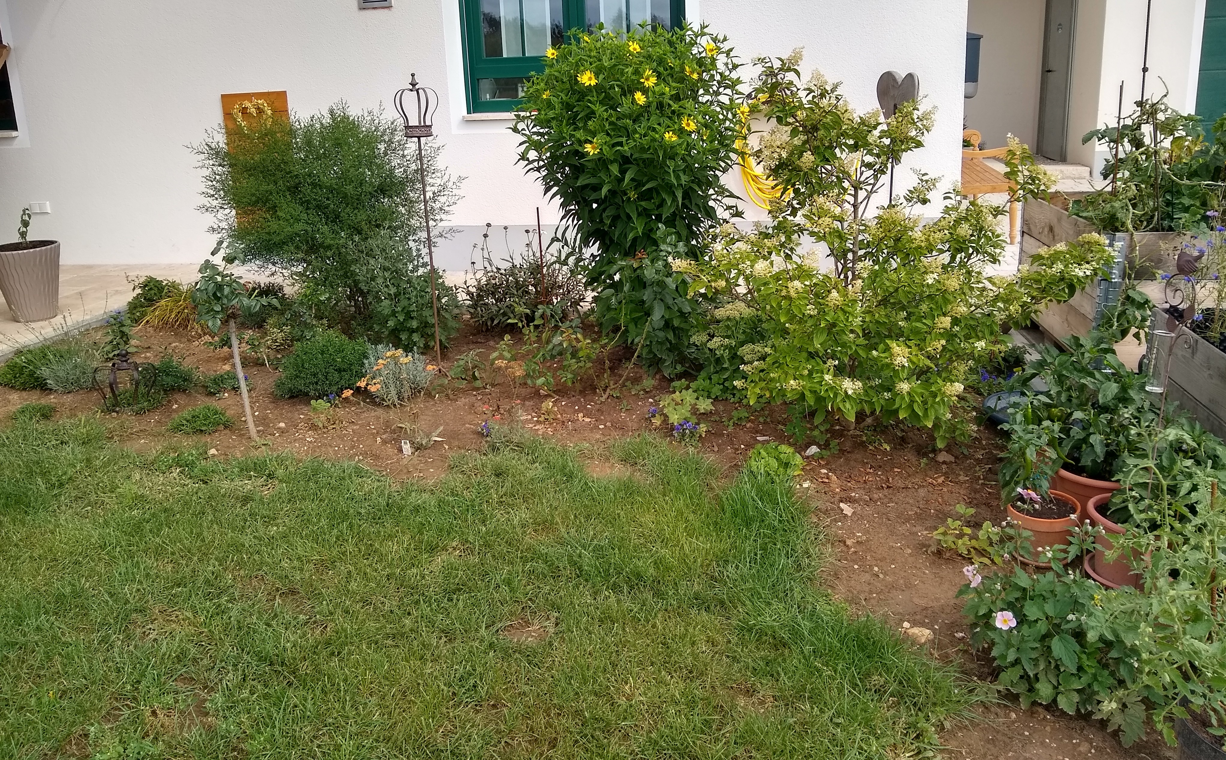Es darf gern etwas bunt sein, nicht steril und nicht "glatt" aber eben ansprechend und von der Blütezeit auch etwas durchmischter. Und lasst euch nicht von den fehlenden Rasenkanten abschrecken, da wissen wir noch nicht wie und was und überhaupt.