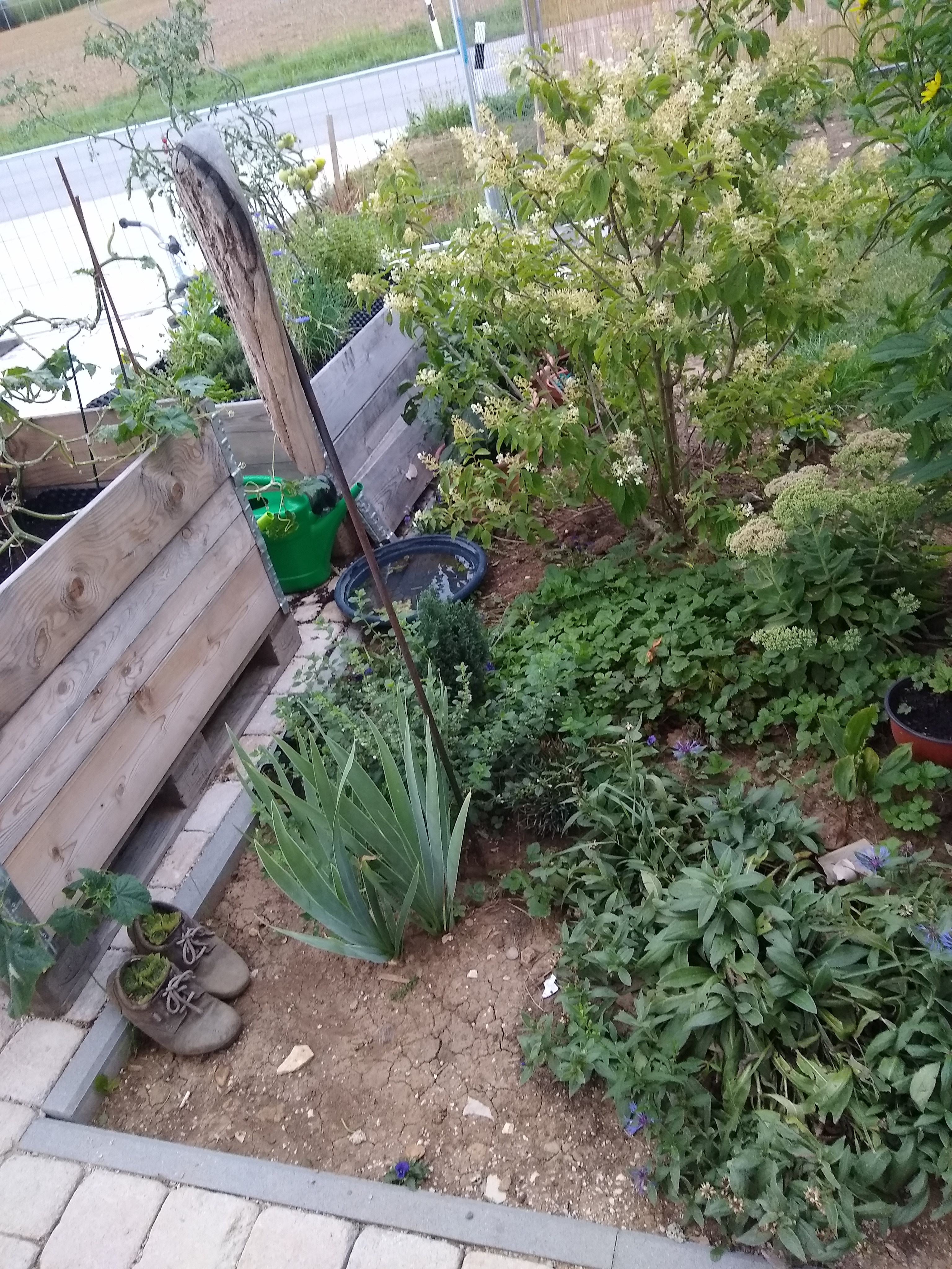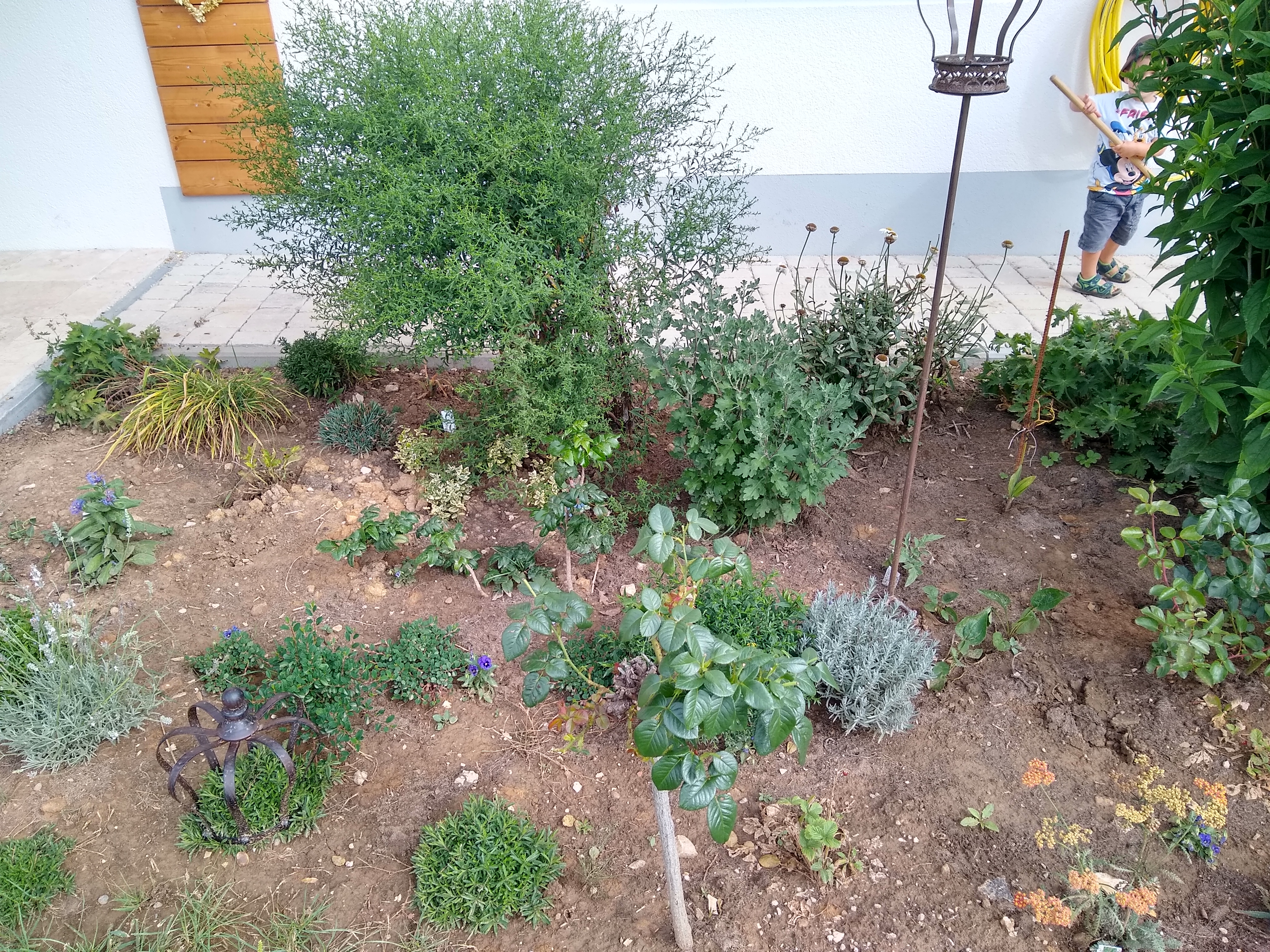Mahonie, weißen und lilanen Lavendel, ein Rosenstämmchen, eine Edelrose, Duftnelken, diverse Bodendecker, viele Hornfeilchen (die sich selbst ausgesät haben und hübsche Farbtupfer hier und da verteilen) eine Fettehenne (die genau zwischen der großen gelben Blume und der Hortensie steht und sich nicht gut entfalten kann) ein Maiglöckchen, eine Zitronenmelisse, eine kleine langsamwachsende Koniferie, eine Taglilie, etwas unbekanntes und viel, viel Unrkaut.