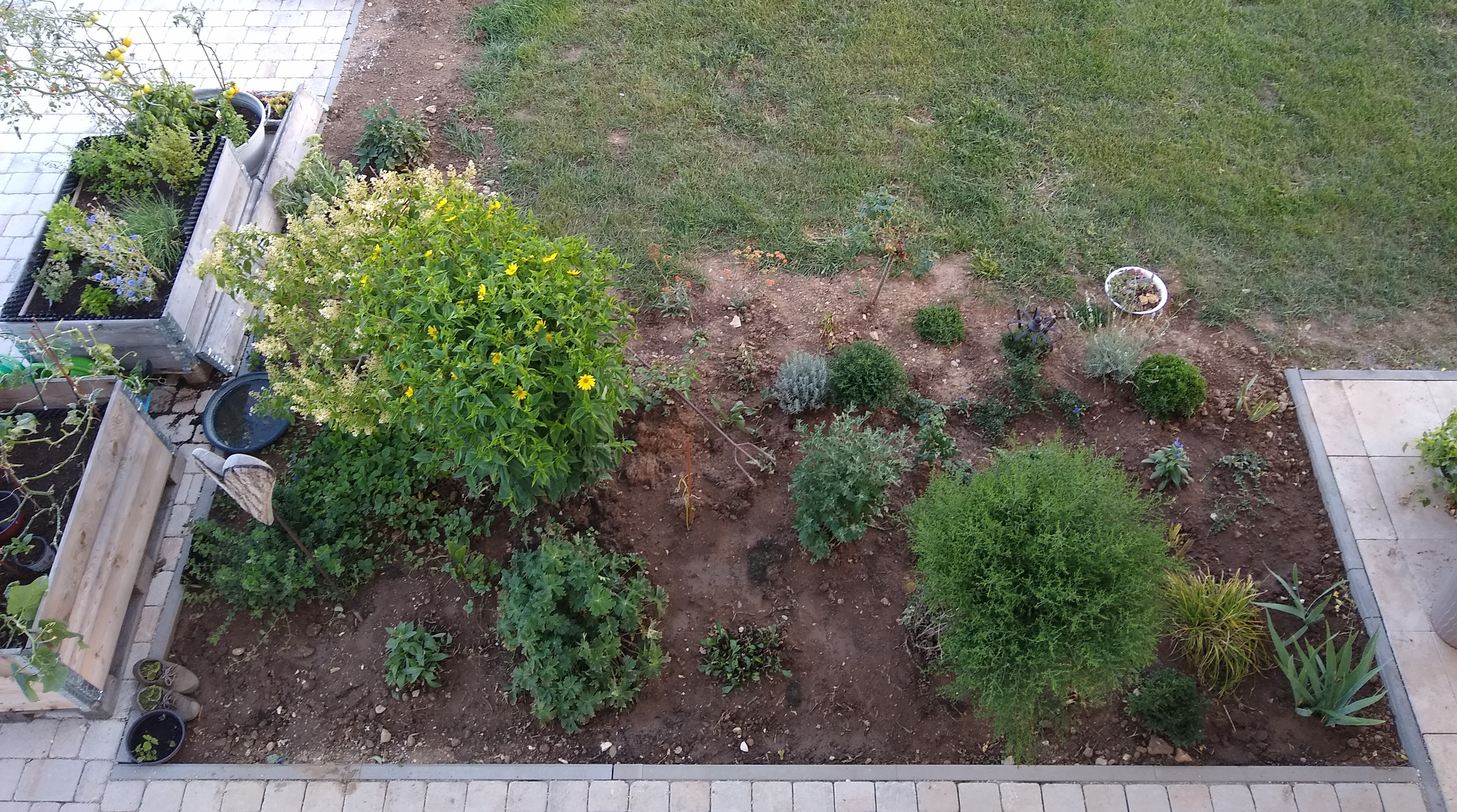 Mahonie, weißen und lilanen Lavendel, ein Rosenstämmchen, eine Edelrose, Duftnelken, diverse Bodendecker, viele Hornfeilchen (die sich selbst ausgesät haben und hübsche Farbtupfer hier und da verteilen) eine Fettehenne (die genau zwischen der großen gelben Blume und der Hortensie steht und sich nicht gut entfalten kann) ein Maiglöckchen, eine Zitronenmelisse, eine kleine langsamwachsende Koniferie, eine Taglilie, etwas unbekanntes und viel, viel Unrkaut.