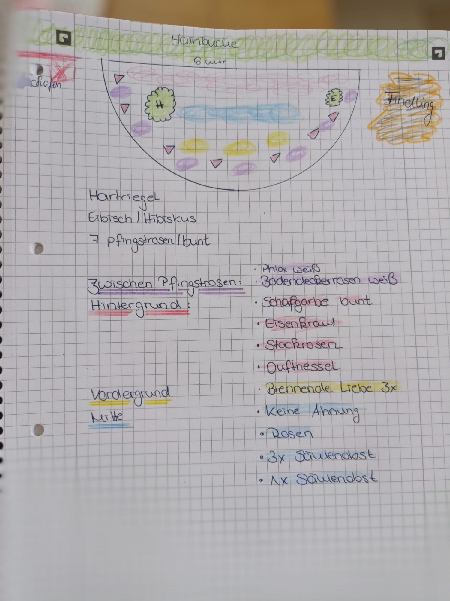 Zwei Rosen im Abstand zur Hainbuchenhecke (wegen dem Heckenschnitt und Nährstoffkonkurrenz!!), die Pfingstrosen, Frühblüher und dazu eventuell noch ein paar Einjährige.
