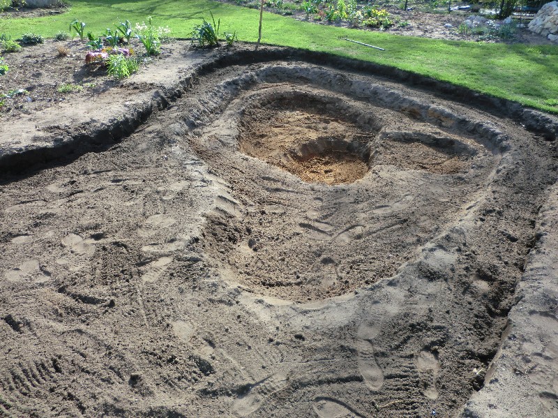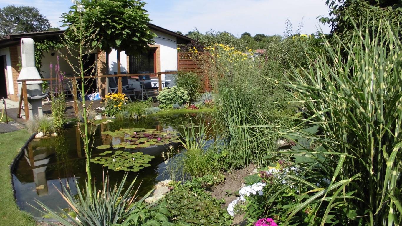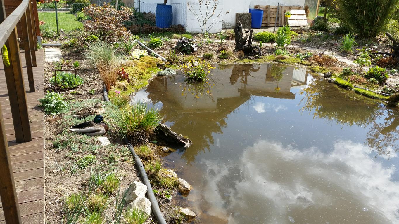 Ja, die Enten machen bei uns Teichhopping. Wühlen einmal den kompletten Teich durch (sieht man auch ganz gut auf dem Foto. Das Wasser ist sonst glasklar), schlafen und fliegen zum nächsten Teich des Nachbarn. Molche, Frösche, Kröten, Libellen und alles was es noch so gibt kann man das ganze Jahr zu jeder Zeit beobachten. Viele Vögel kommen zum Baden und das Ufer wimmelt von durstigen Bienen. Fische habe ich bewusst keine. Dafür brauche ich keine Technik. Regenwasser wird vom Dach über die Regenrinne in den Teich geleitet. Manchmal muss ich aber Grundwasser zulaufen lassen, da recht viel Wasser verdunstet und die Pflanzen viel trinken. An einer Stelle habe ich die Umrandung etwas (nicht viel) tiefer gemacht. Dort kann das Wasser ggf. gezielt überlaufen und versickern.