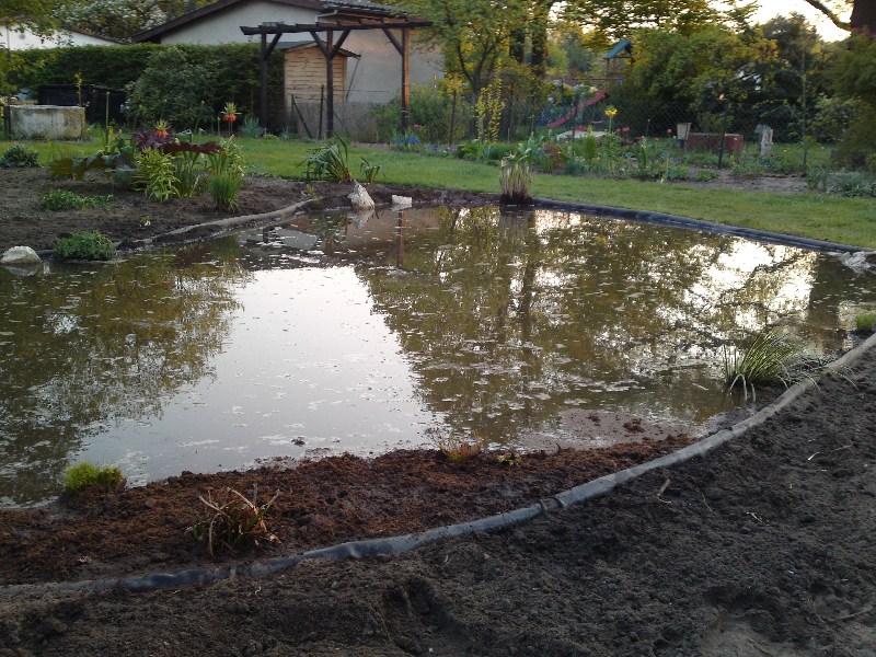 Ja, die Enten machen bei uns Teichhopping. Wühlen einmal den kompletten Teich durch (sieht man auch ganz gut auf dem Foto. Das Wasser ist sonst glasklar), schlafen und fliegen zum nächsten Teich des Nachbarn. Molche, Frösche, Kröten, Libellen und alles was es noch so gibt kann man das ganze Jahr zu jeder Zeit beobachten. Viele Vögel kommen zum Baden und das Ufer wimmelt von durstigen Bienen. Fische habe ich bewusst keine. Dafür brauche ich keine Technik. Regenwasser wird vom Dach über die Regenrinne in den Teich geleitet. Manchmal muss ich aber Grundwasser zulaufen lassen, da recht viel Wasser verdunstet und die Pflanzen viel trinken. An einer Stelle habe ich die Umrandung etwas (nicht viel) tiefer gemacht. Dort kann das Wasser ggf. gezielt überlaufen und versickern.