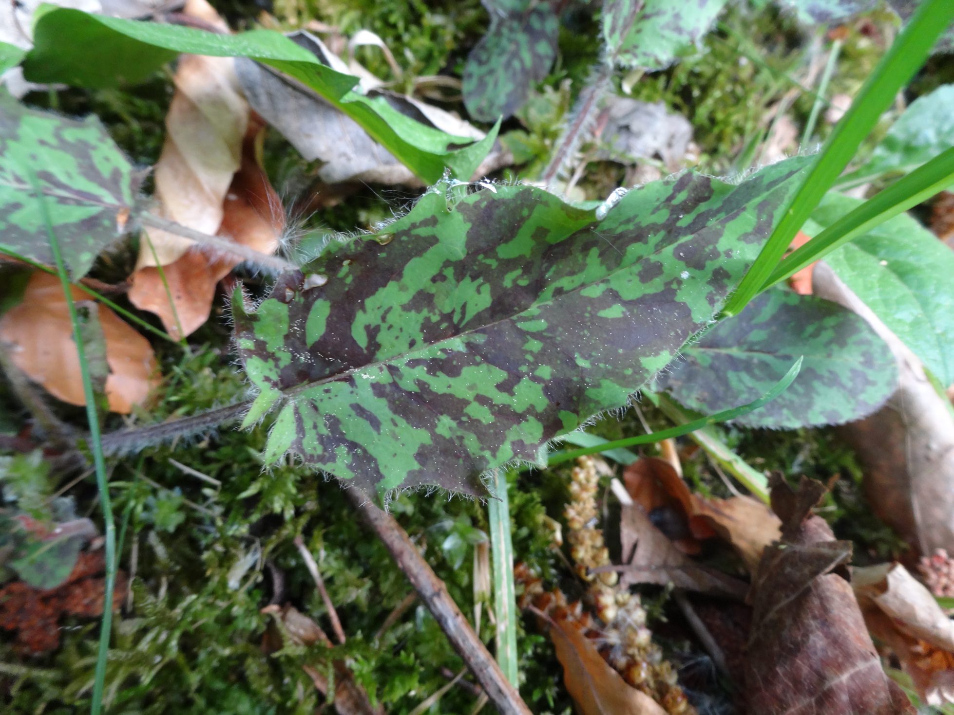 leider macht auch Hieracium murorum solche Blattflecken. Wichtig ist die Anzahl der Stängelblätter für eine Unterscheidung.