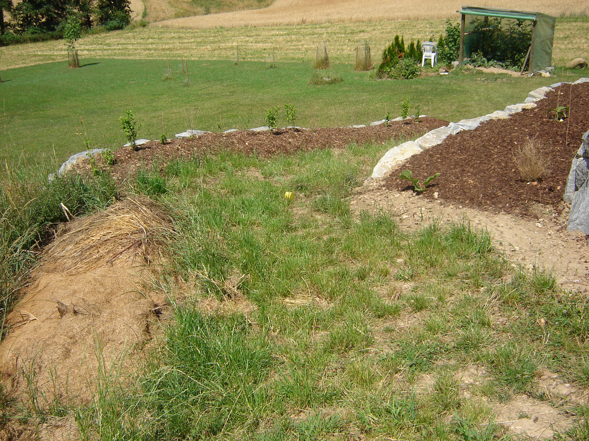 Oder du verlegst seitlich versetzt nach rechts und links große Steinplatten, die dann an der Vorderkante Stufenartig aus dem Hang ragen, am hinteren Ende aber flach mit der Erde abschliessen, so dass man einerseits eine Art Stufen hat, andererseits noch mit der Schubkarre, wenn auch im Zickzack-Kurs, über einen rampenartigen Weg fahren kann, der sich sozusagen zwischen den Stufenplatten "durchschlängelt".