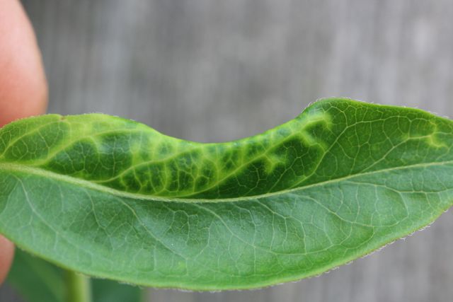 Auf der Blatt-Oberseite sieht man ein 'Muster' aus hellgrünen (gelblichen) Linien, an der Blatt-Unterseite ist der Blattrand leicht eingerollt. Es sind etliche (aber bei weitem nicht alle) Blätter so deformiert.