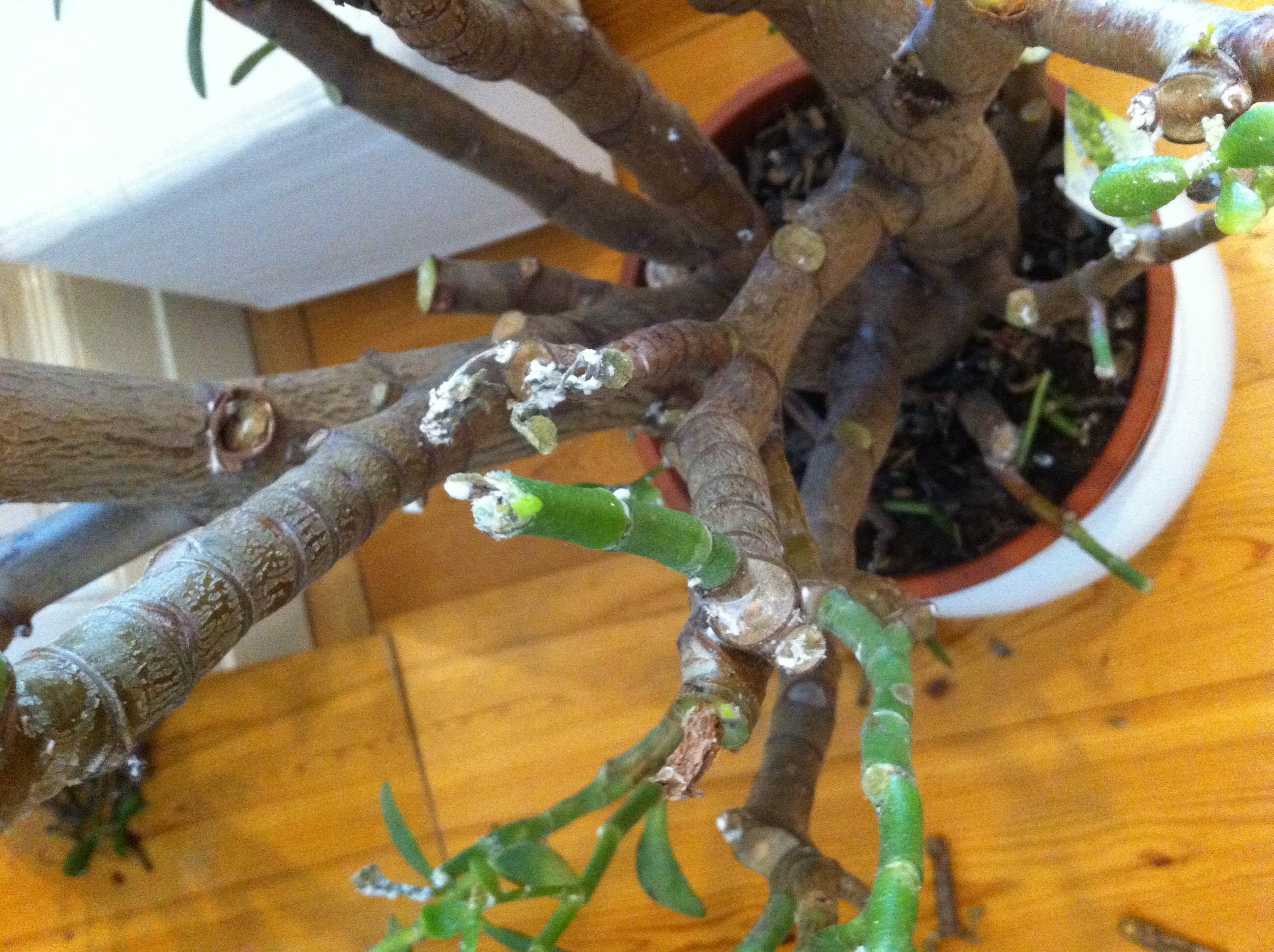 Ich habe vor ca. einem Jahr einen Geldbaum gekauft, der ca. 80 cm hoch ist. Er war wunderschön, total grün und ich muss gestehen, dass ich ihn gekauft habe, weil mir der Verkäufer gesagt hatte, dass man ihn nicht so oft gießen muss und auch generell nicht viel tun muss. Da ich leider nie Glück mit Pflanzen hatte, dachte ich dass ich hier nichts schief machen kann.. Naja, ich habe mich geirrt, anscheinend klappt es bei mir nicht mal mit "einfachen" Pflanzen (((, denn die Äste fallen jeden Tag ab, es ist nicht mal 1/3 übrig von dem was mal da war. und er sieht ziemlich traurig aus, hat weiße komische Punkte und ist total trocken obwohl ich ihn ca. einmal die Woche gieße.. Ich lade auch ein paar Fotos hoch (schade dass ich keine alten zum Vergleich habe), vielleicht kann mir jemand sagen was er hat.. ich kenne mich null aus, denke mal es wird ein Pilz sein?