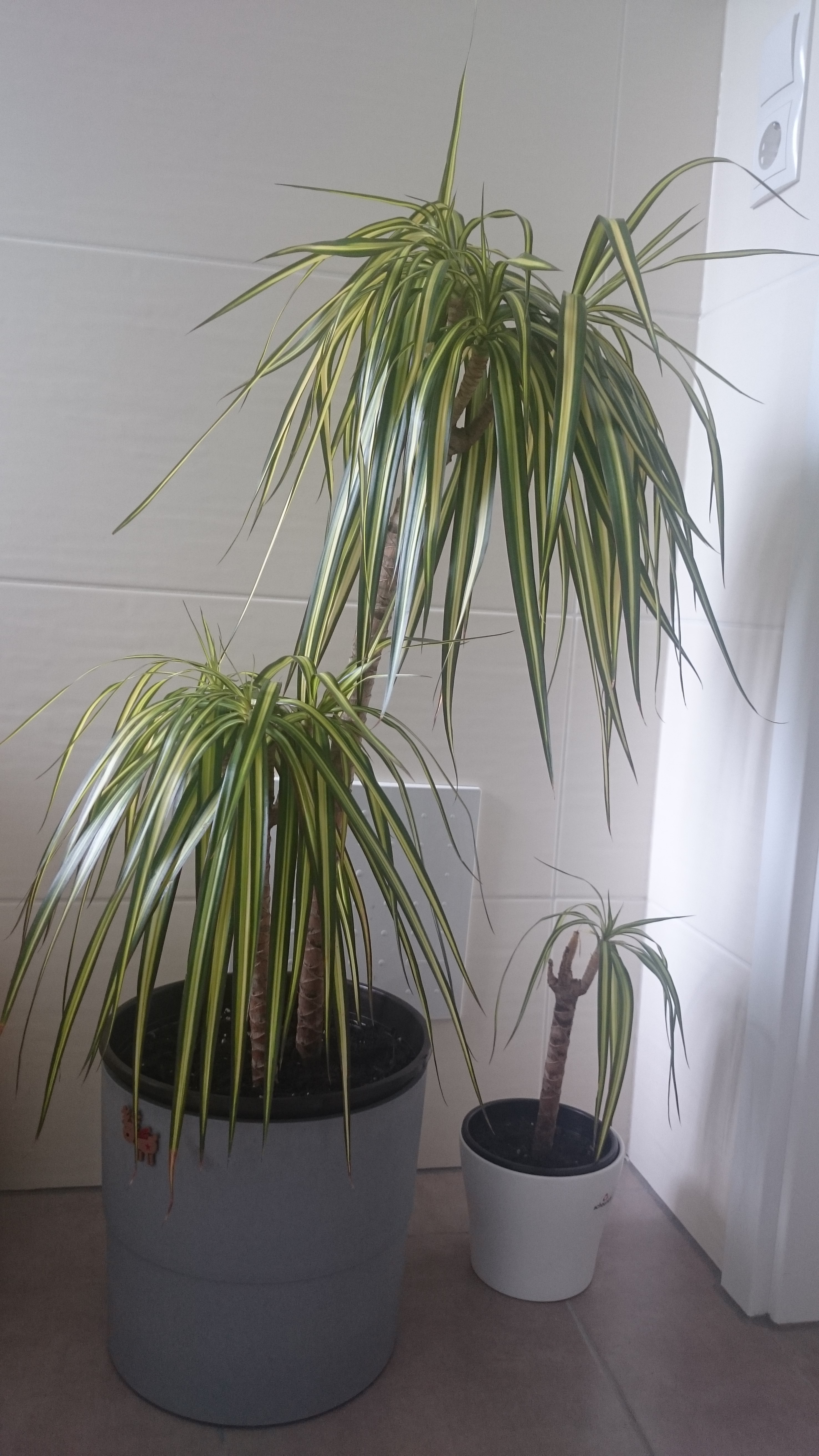 2) Nach dem Umtopfen sind dem kleinen Drachenbaum (weißer Topf) fast alle Blätter abgefallen. Nur noch ein Stamm trägt Blätter. Was kann ich hier tun, dass diese nicht auch noch abfallen?