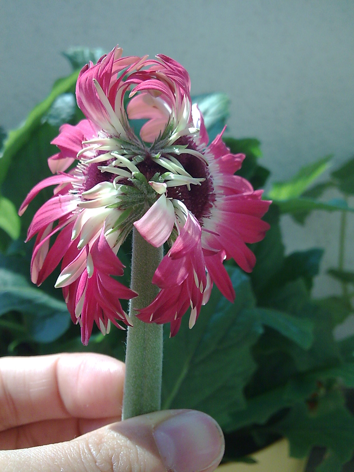 Bei den Baumarkt Gerberas habe ich beobachtet, das sie jedesmal mit wenig Blattwerk und vielen Blueten, sogar missgebildet (2 ineinander gewachsen) verkauft werden. Meiner Meinung nach sind die mit irgendwelchen Bluehhormonen/Duengern behandelt worden und Stauch-